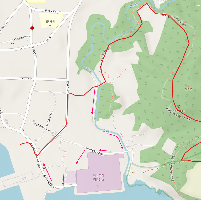 월라봉에서 내려온 올레길 9코스는 창고천을 따라 해안 방향으로 이동한다. 창고천 끝자락에서는 화력 발전소 앞을 지나 발전소 옆에 새롭게 조성된 공원을 지나 화순 해안로를 걸어 화순 금모래 해변에서 9코스를 마무리한다.