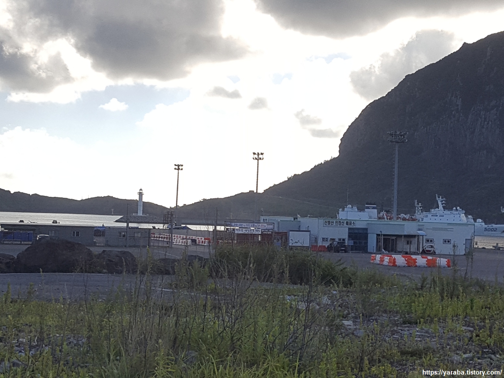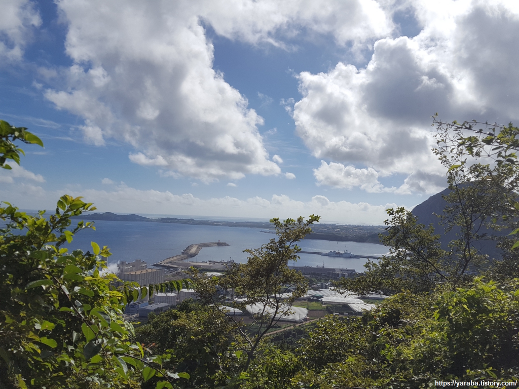 뷰포인트에서 바라본 화순항의 풍경이다. 서쪽으로 지고 있는 태양의 강렬한 햇빛을 받아 더욱 하얗게 빛나는 흰구름들이 존재감을 뽐내는 풍경이다.