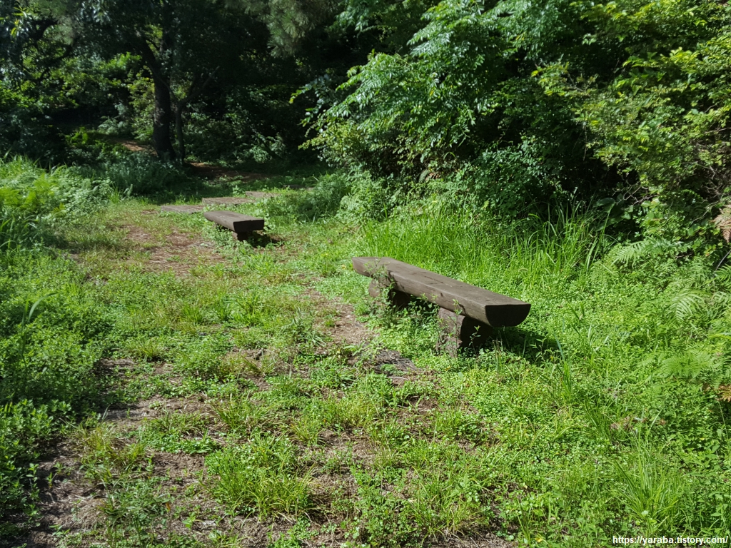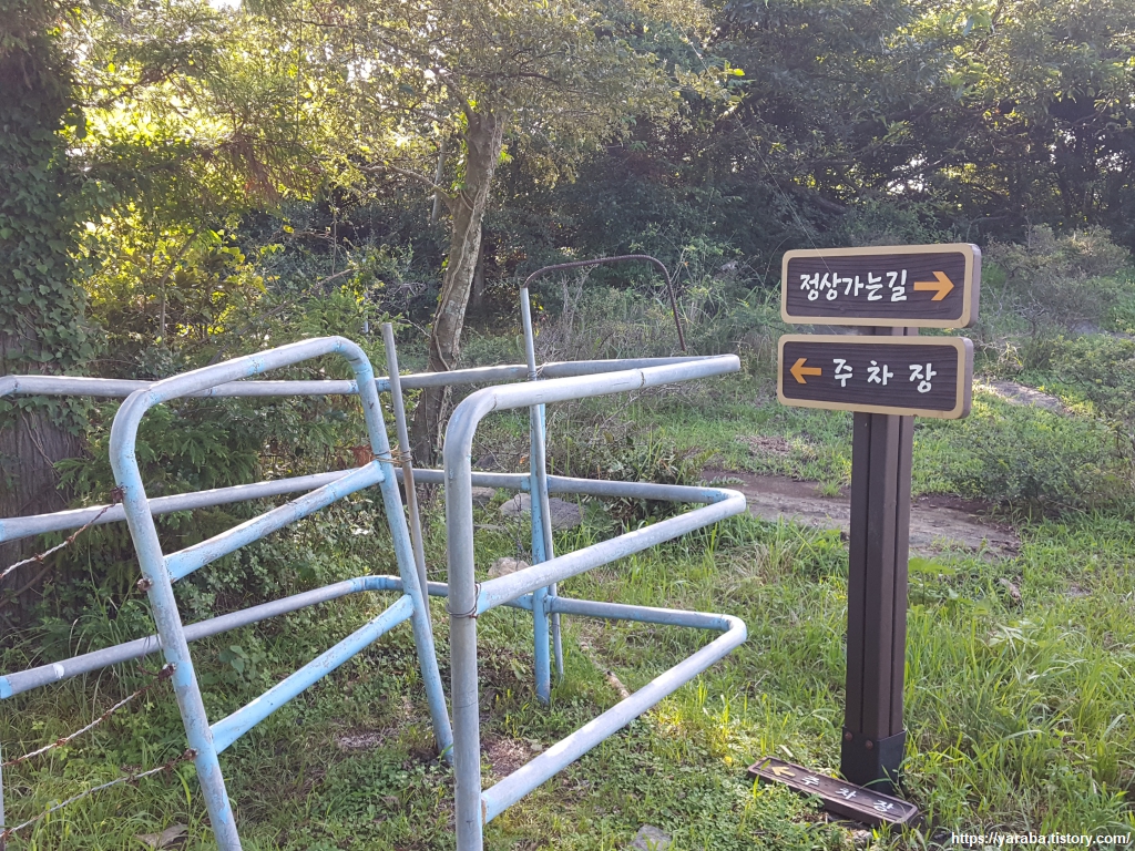 방목하는 말이나 소는 가지 못하지만 사람은 지나갈 수 있도록 만든 출입구를 다시 지난다. 예전에 올레길의 오름을 걸을 때 커다란 소들이 길을 막고 있던 것을 기억하면 오금이 저려올 정도이다. 어떤 어르신이 앞서 가지 않았다면 이러지도 저러지도 못했을 것이다. 동물하고 교감하며 친숙해하는 사람들을 보면 참으로 부럽다. 동물들에게 마음을 여는가 그리고 동물들과 있었던 교감의 경험이 중요할듯하다. 아무튼 소나 말을 마주치지 않은 것이 다행이다. 얼마나 올랐을까 벤치 두 개가 마련되어 있는 월라봉의 뷰포인트에 도착했다.