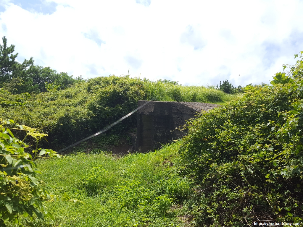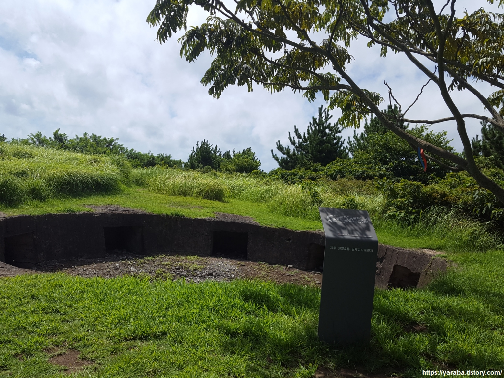 송악산 북쪽으로는 알오름이 3개가 동서로 분포하고 있는데 동쪽에 있는 것을 동알 오름, 서쪽에 있는 것을 섯알 오름, 가운데 있는 것을 셋알 오름이라고 하는데, 가운데 있는 셋알 오름에 있는 일제 고사포 진지다. 모슬포 알뜨르 비행장을 방어하기 위한 시설이었을 것이다. 제주도를 최후의 방어기지로 삼은 것은 일제가 태평양 전쟁 말기 그들이 원자 폭탄으로 패배할 것이라고는 상상도 하지 못한 상황에서 나온 전략이었을 것이다. 진주만 공습으로 수많은 사람들의 목숨을 죽이고, 다시 원자 폭탄으로 수많은 민간인을 살상한 일본과 미국이라는 두 나라가 지금은 세계 정치 현장에서 끈끈한 동맹이고, 일본의 군사 대국화를 앞뒤에서 밀어주고 있는 나라가 미국이니 이런 역사의 아이러니가 없다.