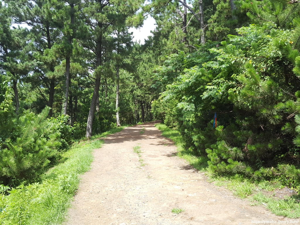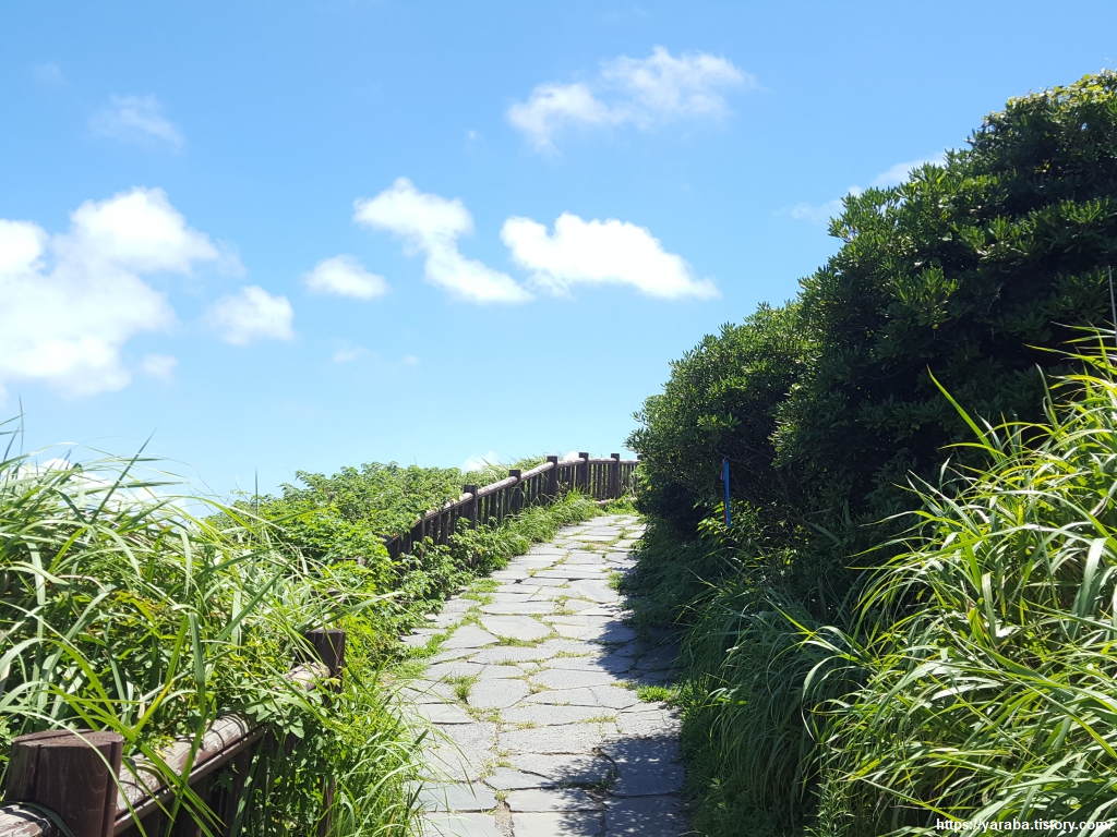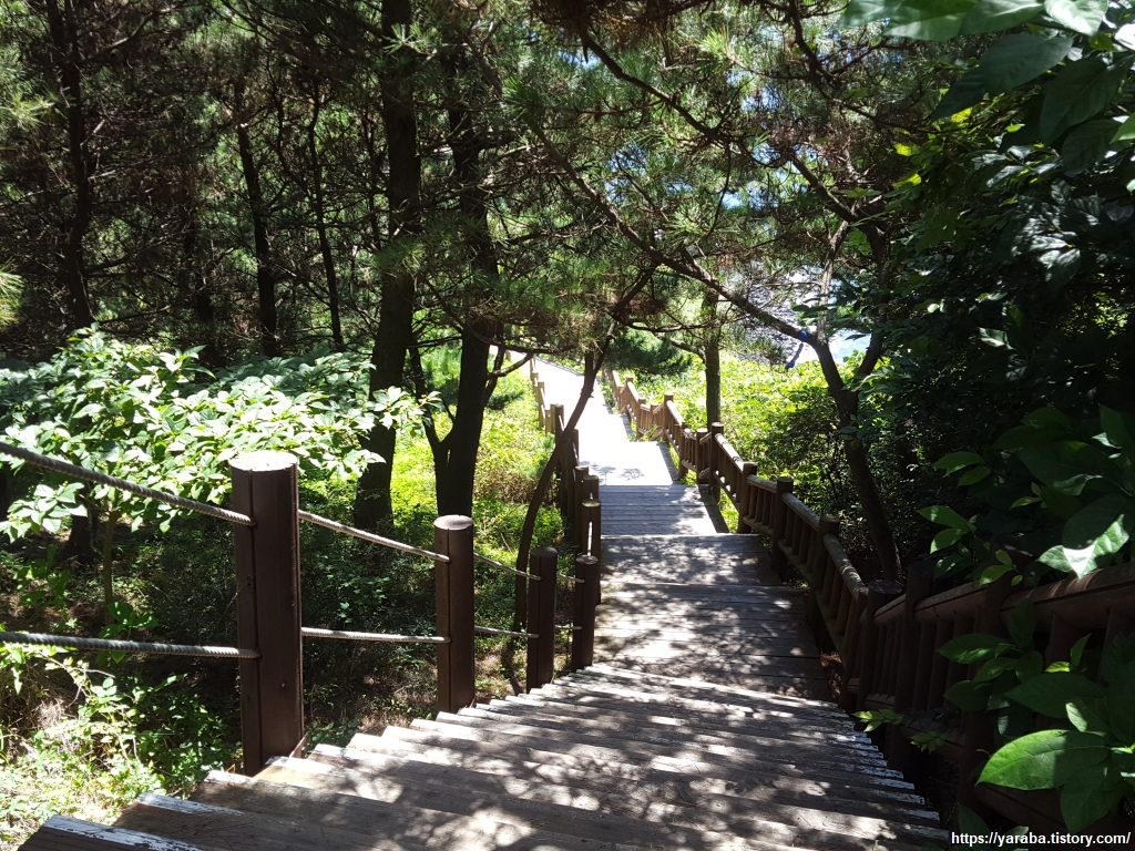 송악산 둘레길이 잘 정비되어 있고 아름다운 풍경이 있는 것은 좋지만 그늘 한점 없고, 오르락내리락 길이 평탄치 않다는 것은 우리 같은 저질 체력에게는 좀처럼 만만한 길은 아니다. 결국 옆지기는 그늘이 있는 데크길 계단 위에서 벌러덩 누워 버렸다. 때마침 반대편에서 올라오는 사람들에게는 송구스러운 상황이었지만, 옆지기가 더 푹 쉴 수 있도록 그냥 두었다. 올라오던 분들도 누워있는 옆지기를 피해서 조심스럽게 길을 이어갔다. 한동안 누워서 쉬던 옆지기는 다행히 몸이 조금 회복되어 계속 길을 이어갈 수 있었다.