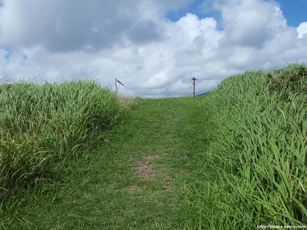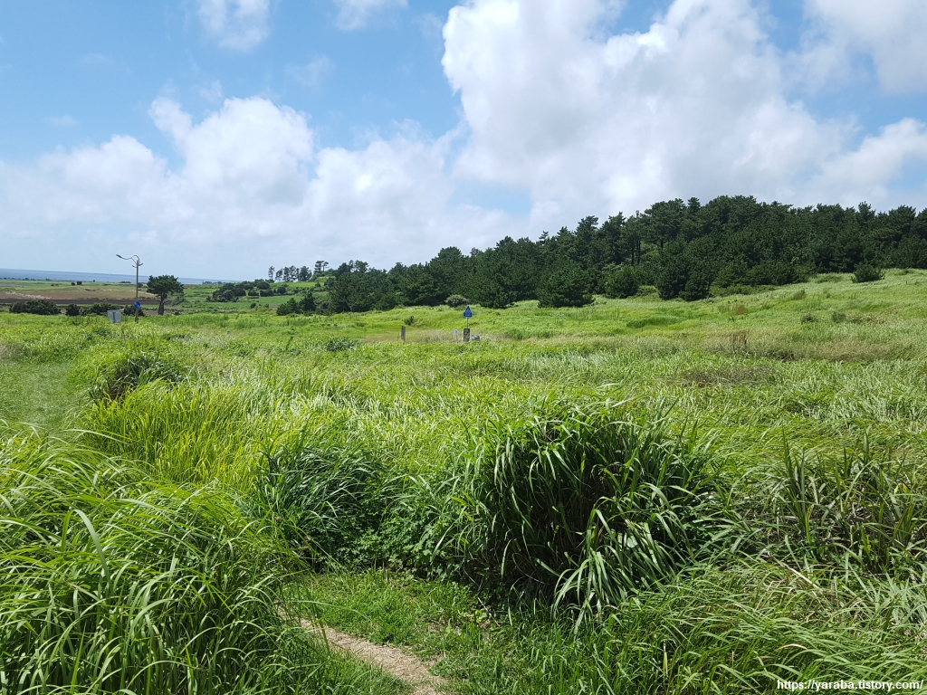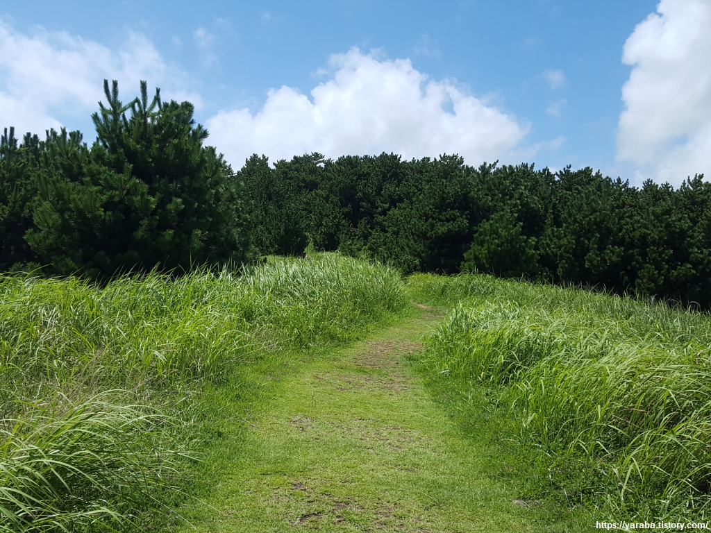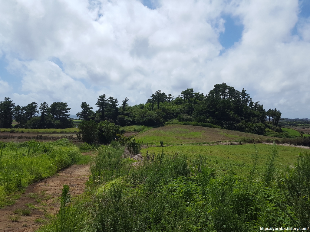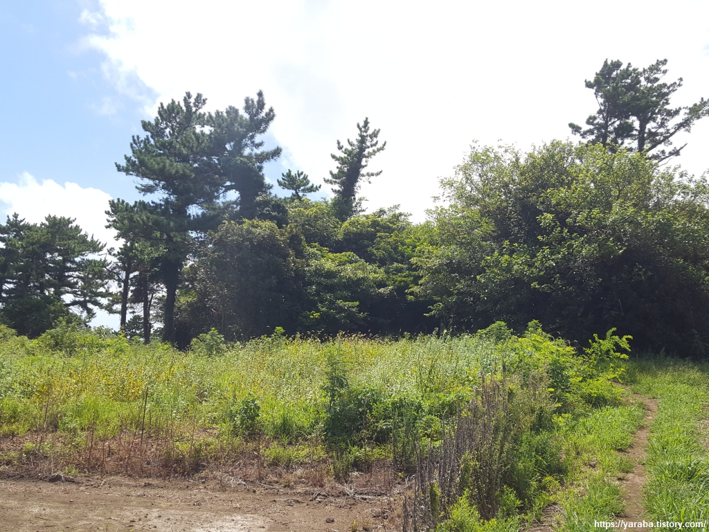 셋알 오름에서 섯알 오름으로 가는 길. 평탄한 평야 지대를 걷는다. 송악산 북쪽의 세 알오름들은 모두 50미터 내외로 높이가 높지는 않다.
