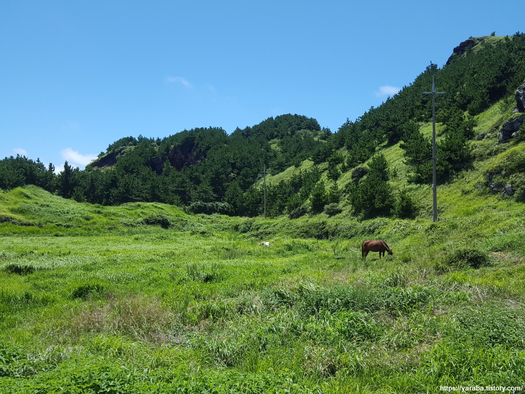 나무가 사라진 무성한 풀밭에서는 방목하고 있는 말들이 평화롭게 풀을 뜯고 있고, 잔잔한 바다 위에는 하얀 물보라를 일으키며 마라도를 오가는 여객선이 평화로운 풍경 속의 주인공이다.