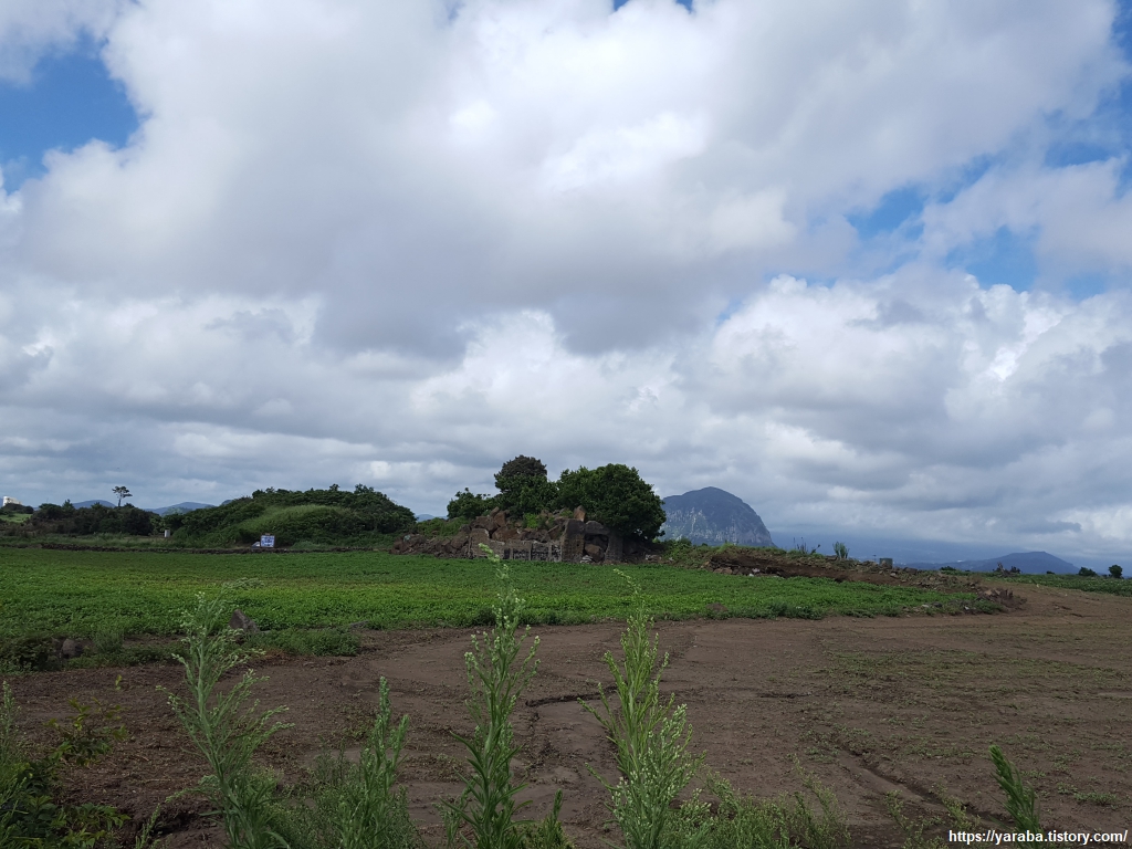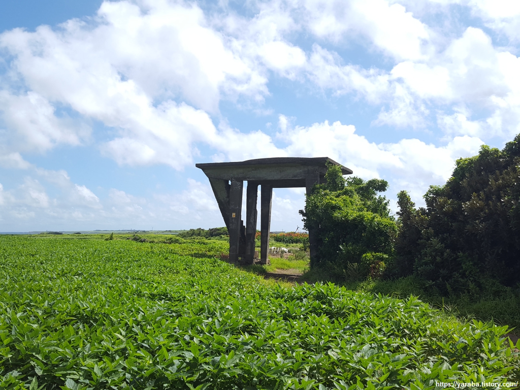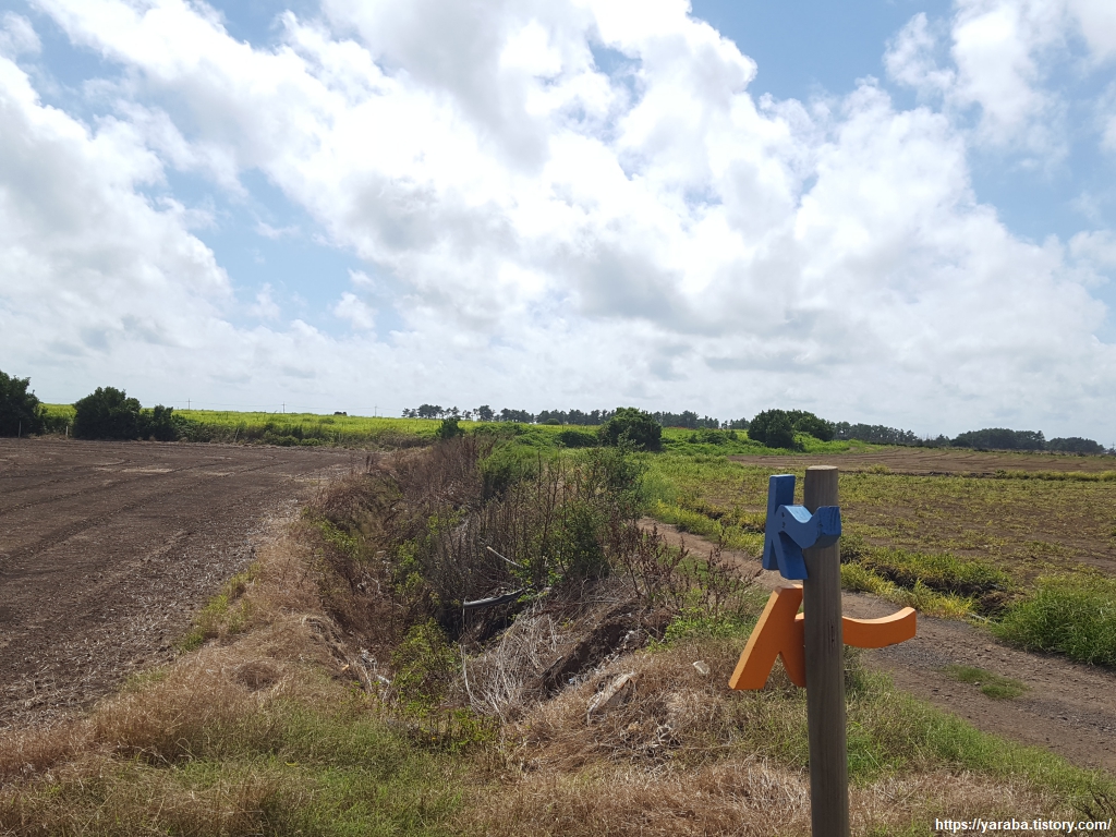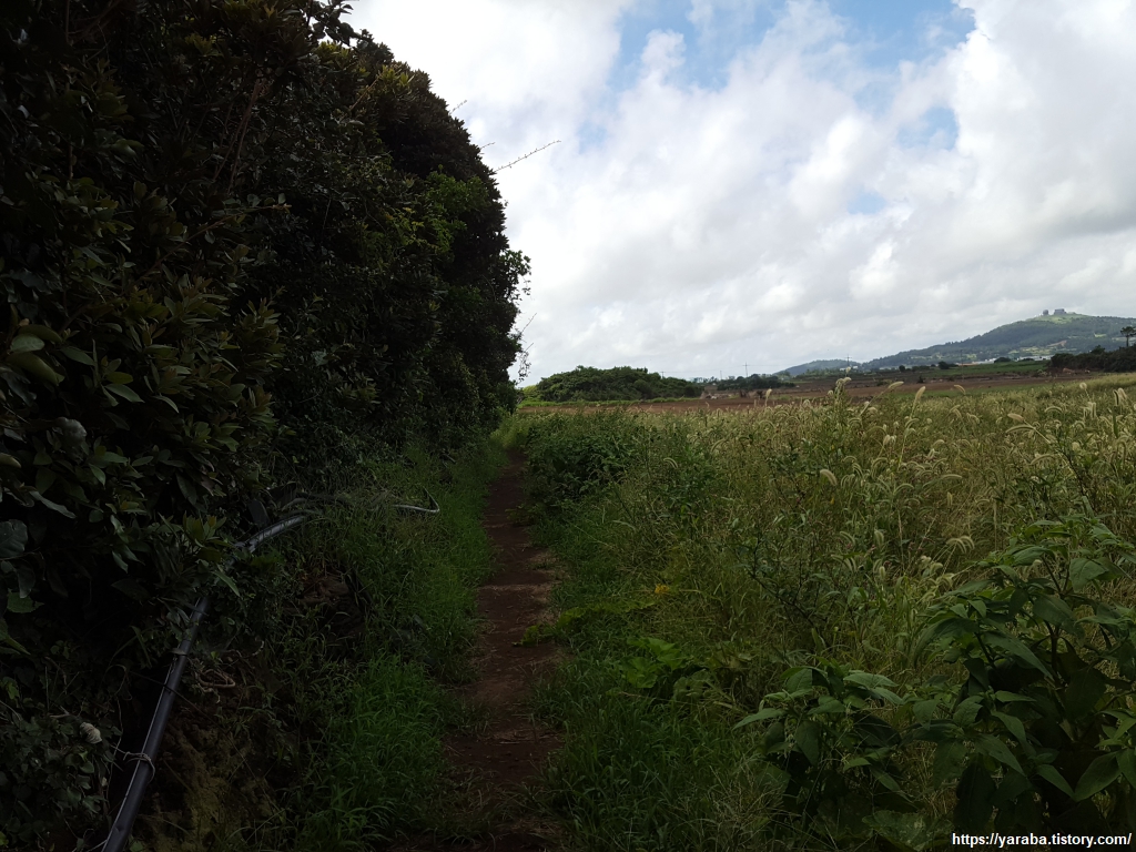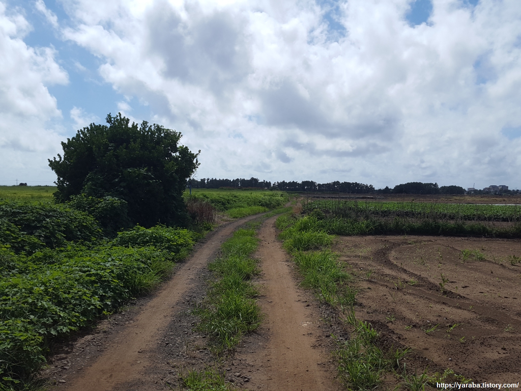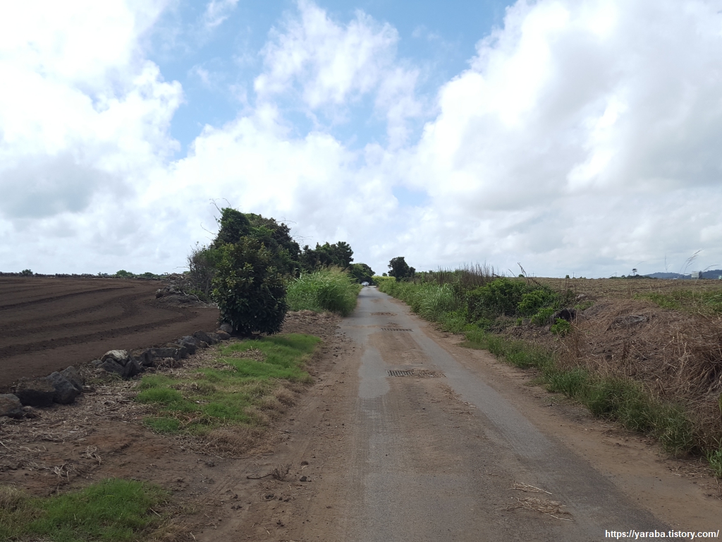 평야 지대의 밭 사이 길을 걷지만 이 길은 모슬포 알뜨르 비행장 자리를 지나는 길이다. 알뜨르의 알은 아래를 의미하고, "드르"는 넓은 들판을 의미하는 제주 방언으로 제주 남쪽의 넓은 들판이란 의미다. 일제 강점기 농민들에게서 강제 수용했던 알뜨르 비행장의 토지는 상당 부분이 국방부 소유로 되어 있다고 한다.