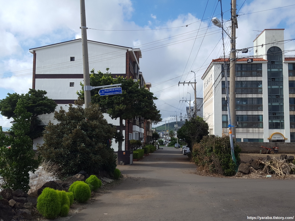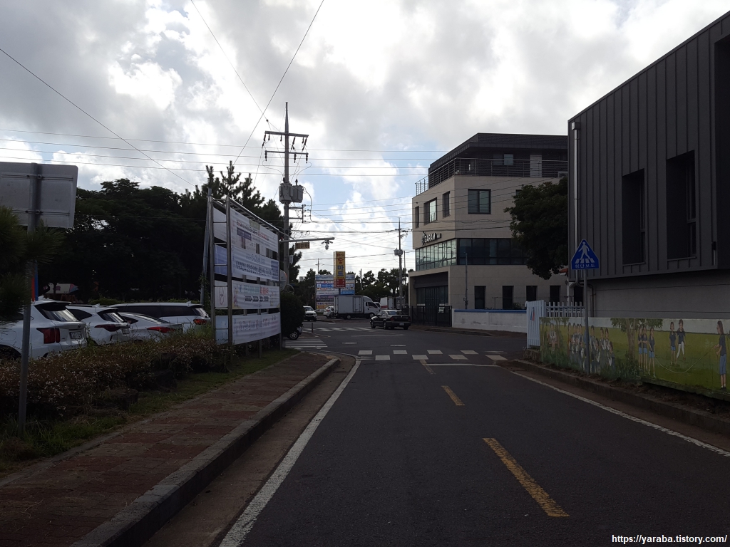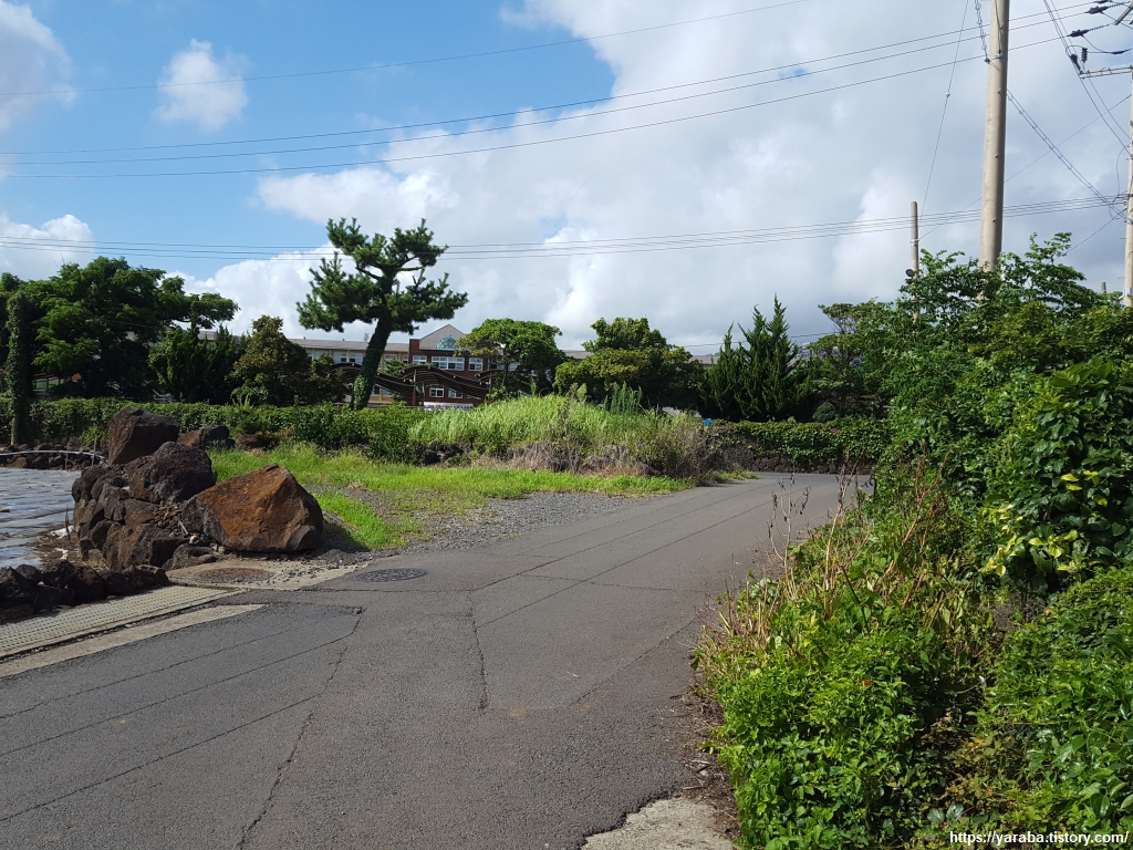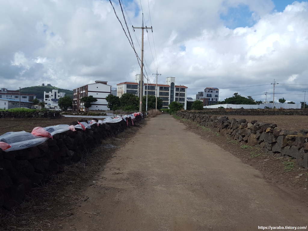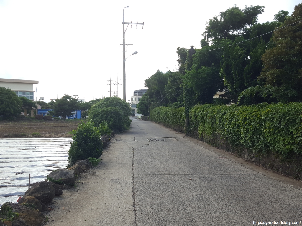 운진항 앞을 지나서 읍내로 향하는 "최남단 해안로" 도로를 따라 걸어도 대정 읍내로 갈 수 있지만 올레길 10코스는 도로에서 우회전하여 마을길로 길을 잡는다.
