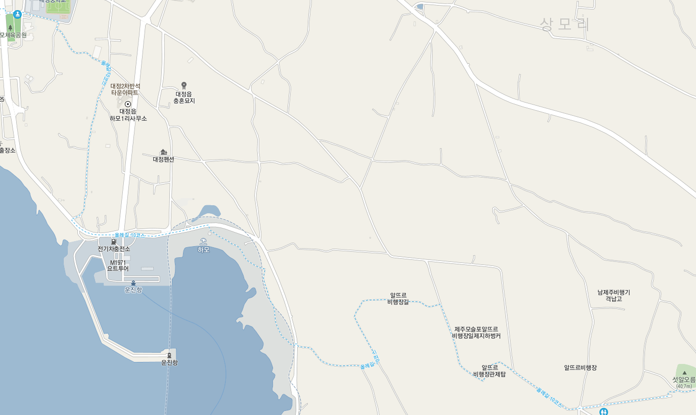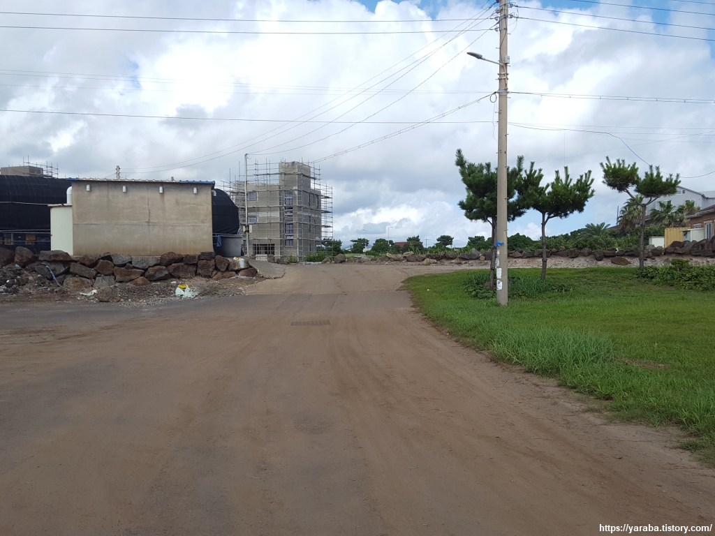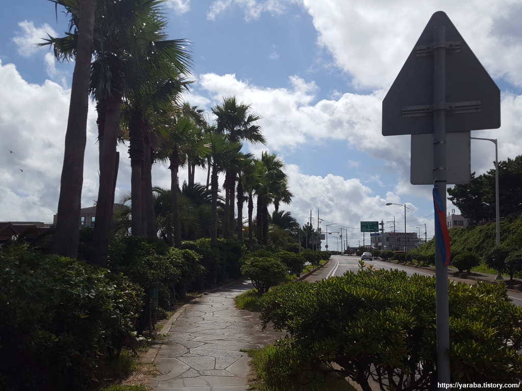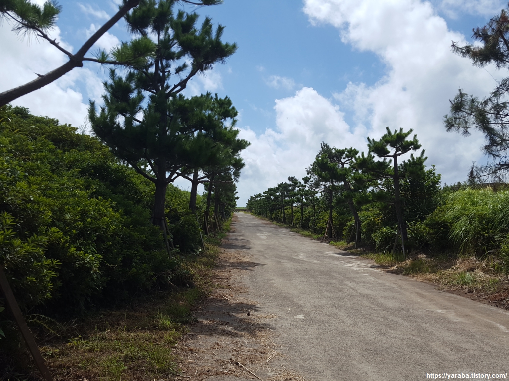운진항 앞을 지나서 읍내로 향하는 "최남단 해안로" 도로를 따라 걸어도 대정 읍내로 갈 수 있지만 올레길 10코스는 도로에서 우회전하여 마을길로 길을 잡는다.