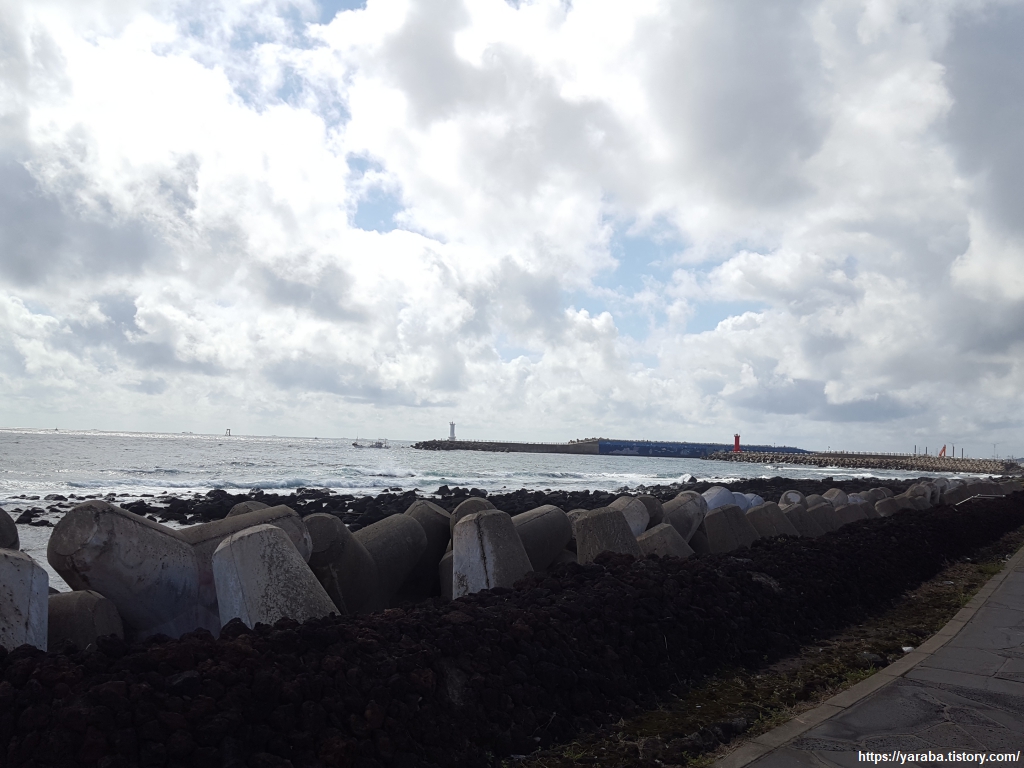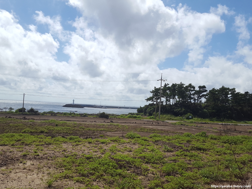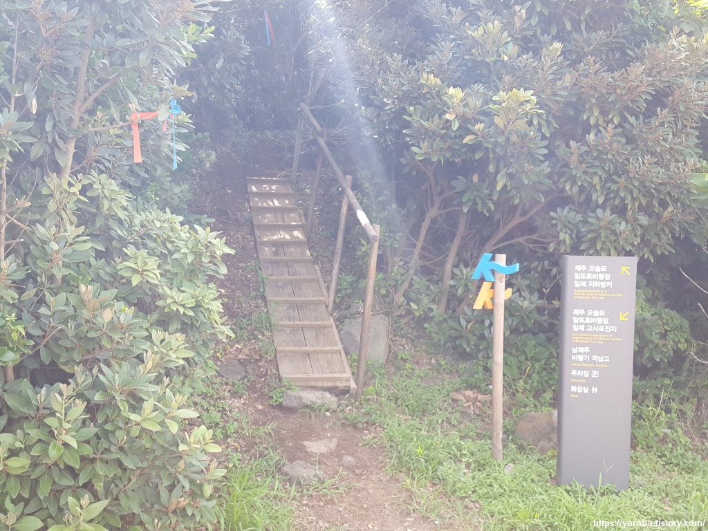알뜨르 비행장이 있던 들판을 가로질러 해안으로 나오면 해안 도로를 건너서 하모리 해안 숲길로 진입한다. 모슬포 남항이라 불리는 운진항의 방파제가 보이는 곳이다.