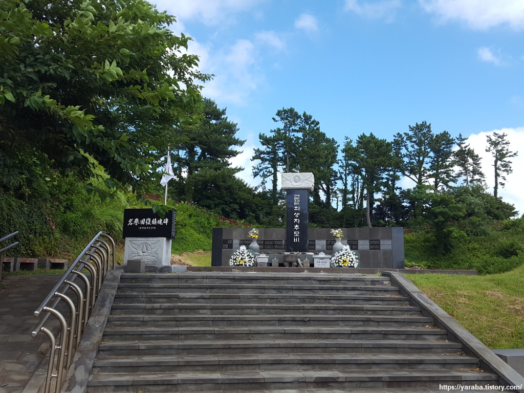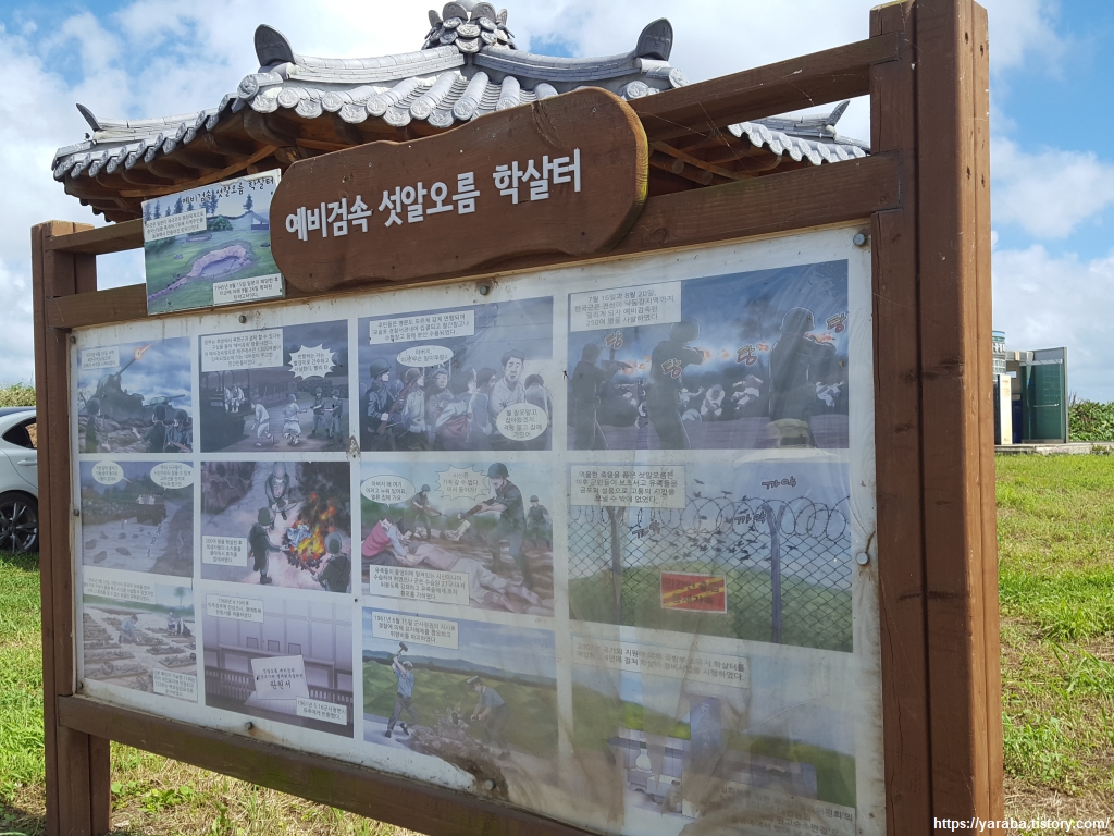 진입로 입구에 이르면 한국 전쟁 당시 섯알 오름에서 있었던 참혹한 상황을 조금이나마 만나 볼 수 있다. 그렇지만 양민들을 향해 방아쇠를 당겨야 했던 해병 대원들도 섯알 오름에서 목숨을 잃었던 사람들도 그저 희생자이고 피해자 일뿐 그 이면에서 자신들의 권력과 안전을 위해 그런 상황을 지시하고 만들었던 사람들은 제대로 된 평가를 받았는가? 하는 질문을 던져보면 그저 공허한 물음표만 되돌아온다. 그 세력은 사회 곳곳에서 여전히 그 위세를 떨치고 있다고 보는 것이 맞다.