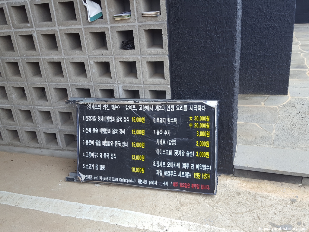 평소에는 가격을 보고는 그냥 지나쳤겠지만, 앞으로 걸어갈 올레길 12코스를 위한 투자라 생각하고 "강 셰프의 키친"이라는 곳에서 식사를 하기로 결정했다. 단순하지만 알찬 메뉴 구성이 망설임 없이 식사를 결정한 매경이기도 했다. 값어치를 하는 식사였다.