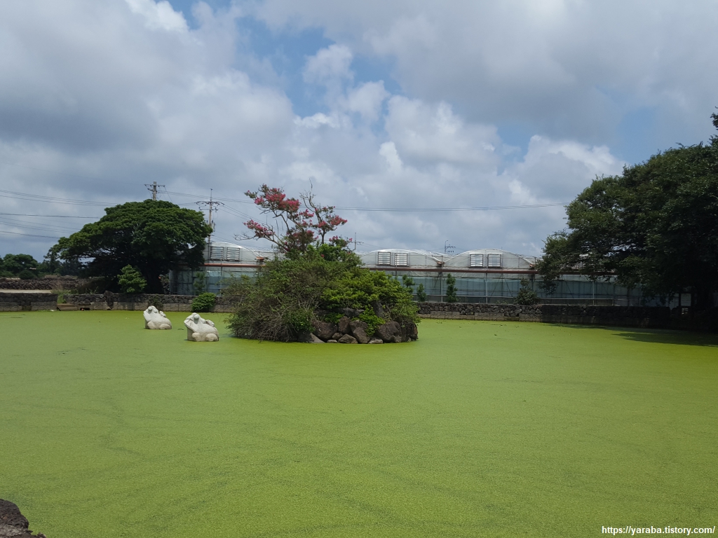 조금 먼 거리에서 처음 보았을 때는 잘 정비된 잔디인 줄 알았다. 마을에 상수도가 공급되기 이전에는 마을 사람들이 용수로 사용하던 구남물이라는 연못이다. 가뭄에도 마르지 않아서 인근 마을에서도 물을 뜨러 왔었다고 한다. 지금은 수생 식물이 가득하여 멀리서 보면 마치 잔디처럼 보인 것이다. 수생 식물 사이로 개구리나 물고기가 다녀간 길만이 이곳이 연못임을 알려주고 있다. 연못 중앙에는 배롱나무가 붉은 꽃을 뽐내고 있고 연못 주위로는 수령 3백 년을 자랑하는 팽나무들이 연못의 역사와 함께하고 있었다.