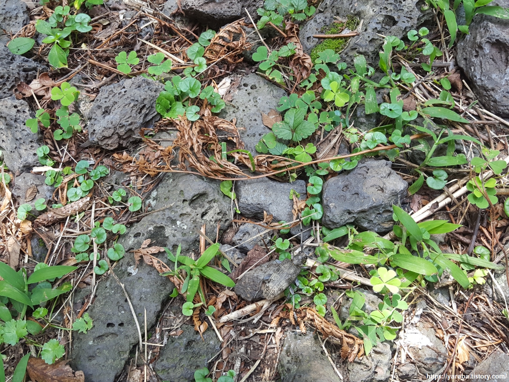 무릉 곶자왈을 돌아 나와 이제는 인향동을 향해서 아름다운 숲길을 걷는다. 곶자왈의 한 축이 양치식물, 나무와 덩굴들이 만들어 내는 숲이라면 또 다른 한 축은 울퉁불퉁한 현무암 돌바닥이다. 돌 사이사이의 틈을 비집고 나오는 생명의 기운이 뿜 뿜 한다.