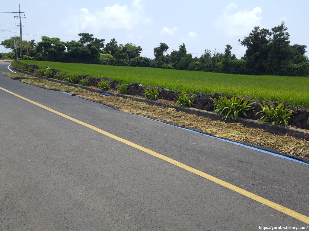 도로변으로 참깨를 말리고 있는데 그 뒤로 푸르름을 뽐내고 있는 벼가 보인다. 제주도에서도 논농사가 가능하다고? 제주의 곡창 지대라는 무릉리는 제주에서는 쉽게 볼 수 없는 벼농사가 이루어지는 곳이다. 큰 평야는 삶은 고단 했겠지만 살기 좋은 무릉리라는 이름을 주었을 것이다. 벼농사를 짓기는 하지만 육지처럼 물이 항상 찰랑거리는 무논에서 키우는 것이 아니라 밭에서 키우는 밭벼를 재배한다. 무릉리에서 키우는 벼를 "산듸쌀"이라고 부른다. 제주에는 "산듸"라는 밭벼 품종 외에도 되스리, 갈산듸, 원산듸라는 품종이 전해지고 있다.