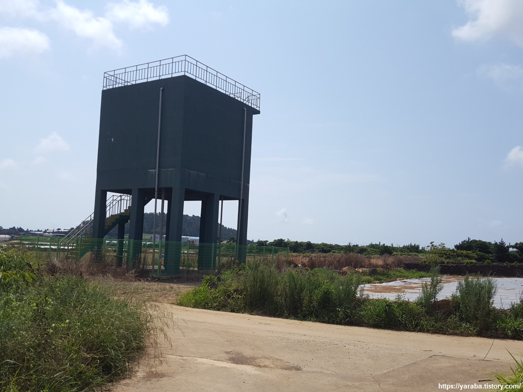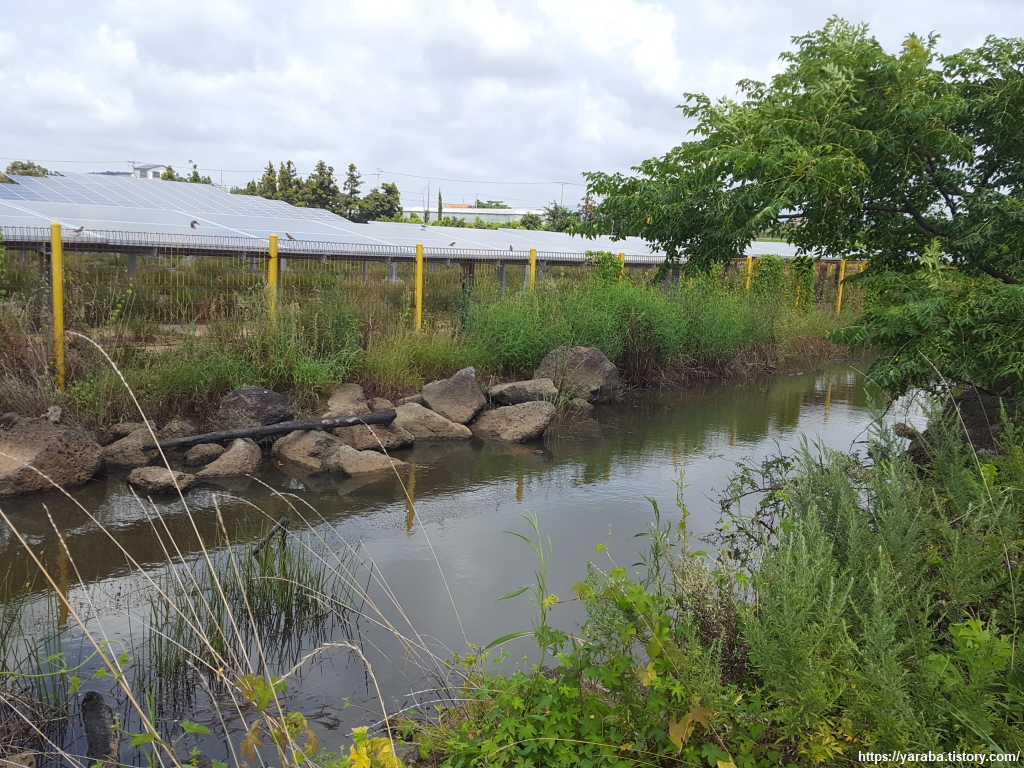 무릉리 태양광 단지도 지난다. 발전 단지 바로 옆 고랑에는 물이 가득하다. 대정리 들판에서는 생경스러운 장면이기는 하다. 인근으로 흐르는 큰 하천이 없으니 무릉리 지역은 사진처럼 물을 모아두는 고가수조가 많기 때문이다. 물이 필요하다고 농가마다 무작정 지하수를 판다고 해결될 문제도 아닐 것이다. 이곳은 제주도 면적의 30퍼센트가 묶여 있는 지하수 특별 관리 지역으로 함부로 사설 지하수를 개발할 수 없는 지역이라고 한다. 지하수 수위가 낮거나 해수 유입 우려가 있는 곳, 가뭄 시 지하수 과다 취수 우려가 있는 곳을 지정한다. 지하수처럼 사람 눈에 잘 보이지 않는 자원을 잘 관리하는 일은 정말 쉽지 않을 듯하다. 누군가의 즉흥적 판단으로 될 일도 아니고 후손을 포함한 많은 이들에게 고루 혜택이 돌아가도록 하는 일이니 쉬운 일은 아니다. 물론 끝없는 욕망과 욕심의 결정체인 사람이 눈에 보인다고 잘 관리하는 것은 아닐 것이다.
