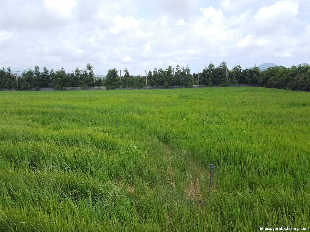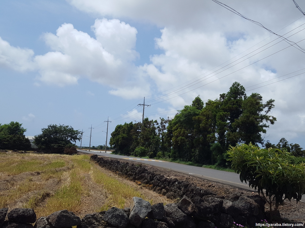 육지의 논에서는 상상할 수 없는 그림이다. 벼농사를 짓는데 스프링클러라니! 물이 찰랑찰랑하는 무논이 아니라 밭벼라고 하면 이해가 되는 그림이기는 하다. 이 화산섬에서 누렇게 익은 황금물결을 바라보는 풍족함이란! 상상만 해도 흐뭇하다.