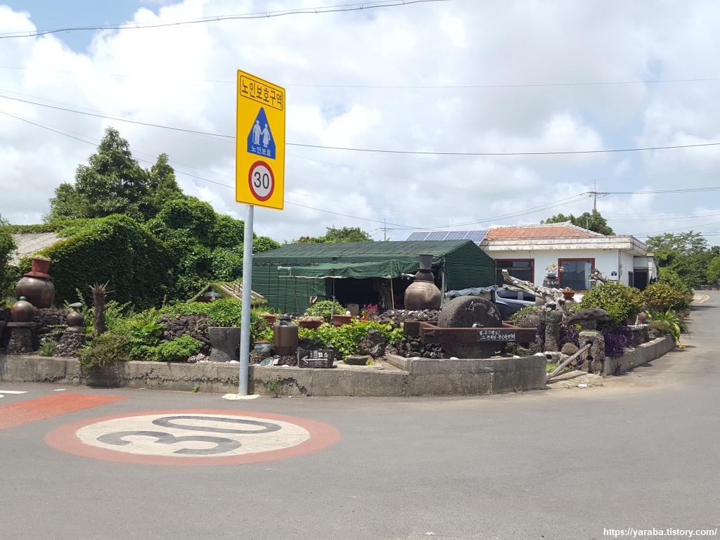 무릉 보건소 앞 공원과 놀이터, 연자 맷돌에 그려진 올레 12코스 화살표까지 정겨운 마을길이다. 무릉 2리 마을 보물 중의 하나인 "보리수나무 그늘집"이다. "영 오십대강? 오잰허난 복삭속앗수다" 나는 대충 이렇게 추측했었다. 혹시 오십 대입니까? 오 저는 완전히 속았네요! 알고 보니 추측도 해석도 완전히 엉터리였다. 진짜 뜻은 "오셨습니까? 오시느라 많이 고생하셨습니다"라고 한다.