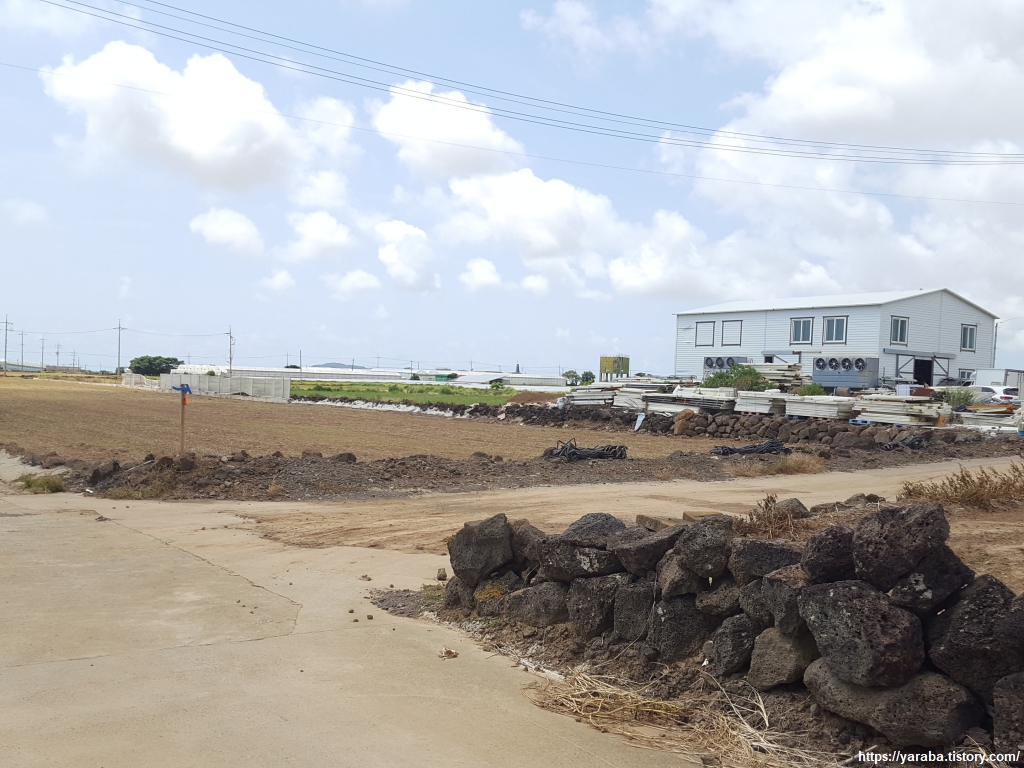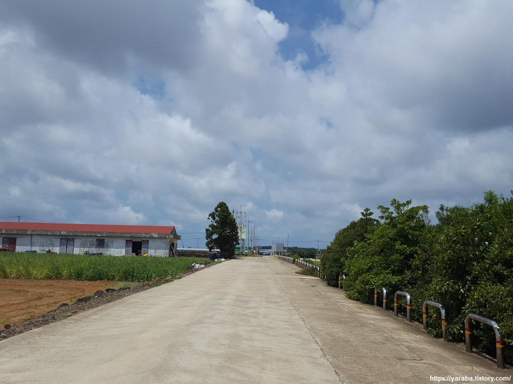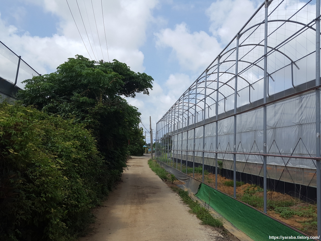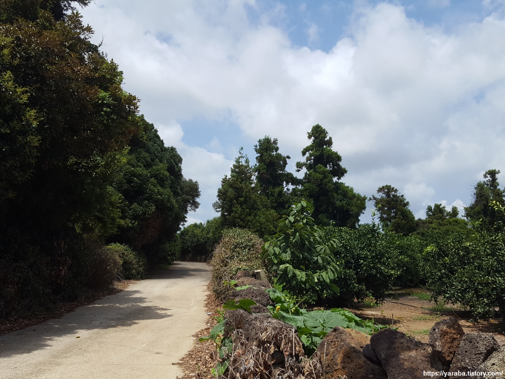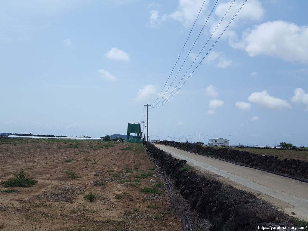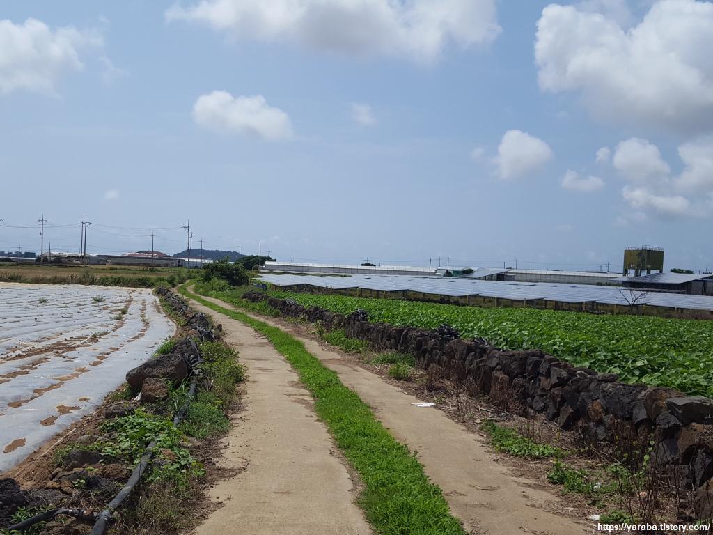 광활한 들판을 걷지만 제주의 들판에는 나무들이 있어 휑하지 않다. 중간중간에 감귤밭이 있는 덕택인 것이다. 노지 감귤밭이 모두 없어지면? 하는 무서운 질문의 결과는 나무 없는 비닐하우스와 노지 밭의 연속인 것이다.