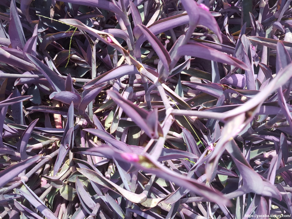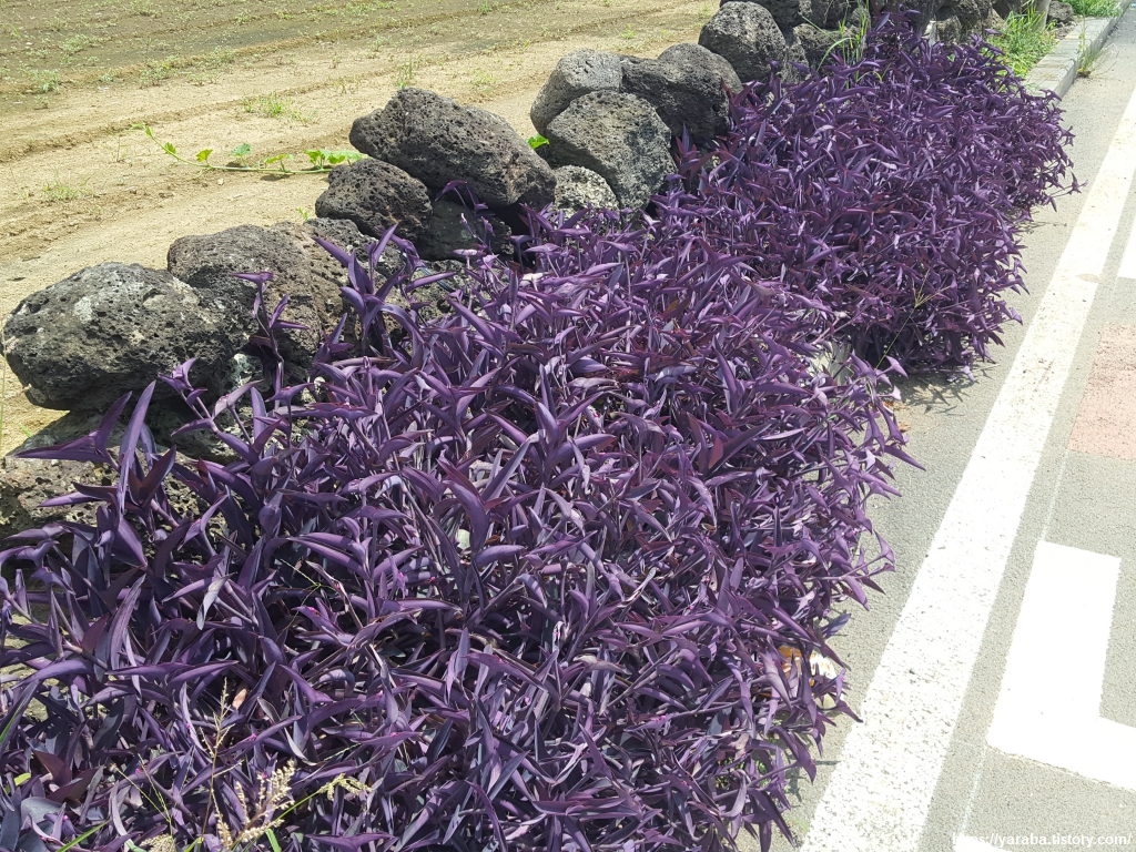 닭의장풀과의 여러해살이풀인 자주색 달개비가 돌담장을 화려하게 장식하고 있다.