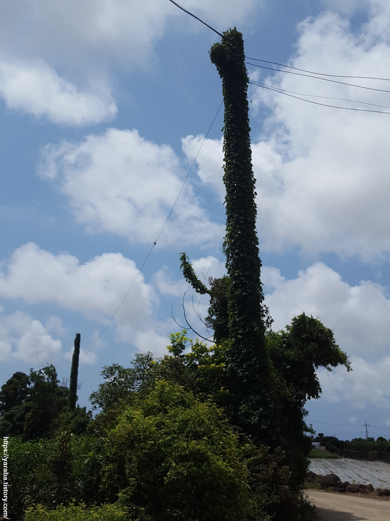 들판을 걷다 보면 넓은 밭보다는 감귤밭을 지날 때가 풍경이 좋다. 감귤 나무를 위해서 방풍 나무를 심는 까닭이다. 제주도 감귤밭에는 방풍목으로 편백나무, 삼나무, 동백나무를 많이 심으니 노지 감귤 밭을 지날 때면 나무가 주는 풍경이 좋을 수밖에 없다. 그런데, 최근에는 웃자란 방풍목들이 햇빛을 막고 경관을 해쳐서 민원이 발생하는 문제가 있다고 나무를 잘라내는 사업을 한다고 한다. 올레길에서 댕강 댕강 잘려 나가는 나무들이 안타까웠는데 완전히 자르는 것보다는 조금은 흉하더라도 중간 가지를 자르는 정비 작업이 그나마 양반이다. 전봇대를 완전히 휘감은 덩굴이 색다른 그림도 선사한다. 전력회사 직원들은 덩굴이 마르면 화재 위험이 있으니 짜증 나고 싫어하는 그림일 것이다. 방풍 나무도 덩굴도 자신이 처한 환경과 입장에 따라 하늘과 땅의 인식 차이가 있다.