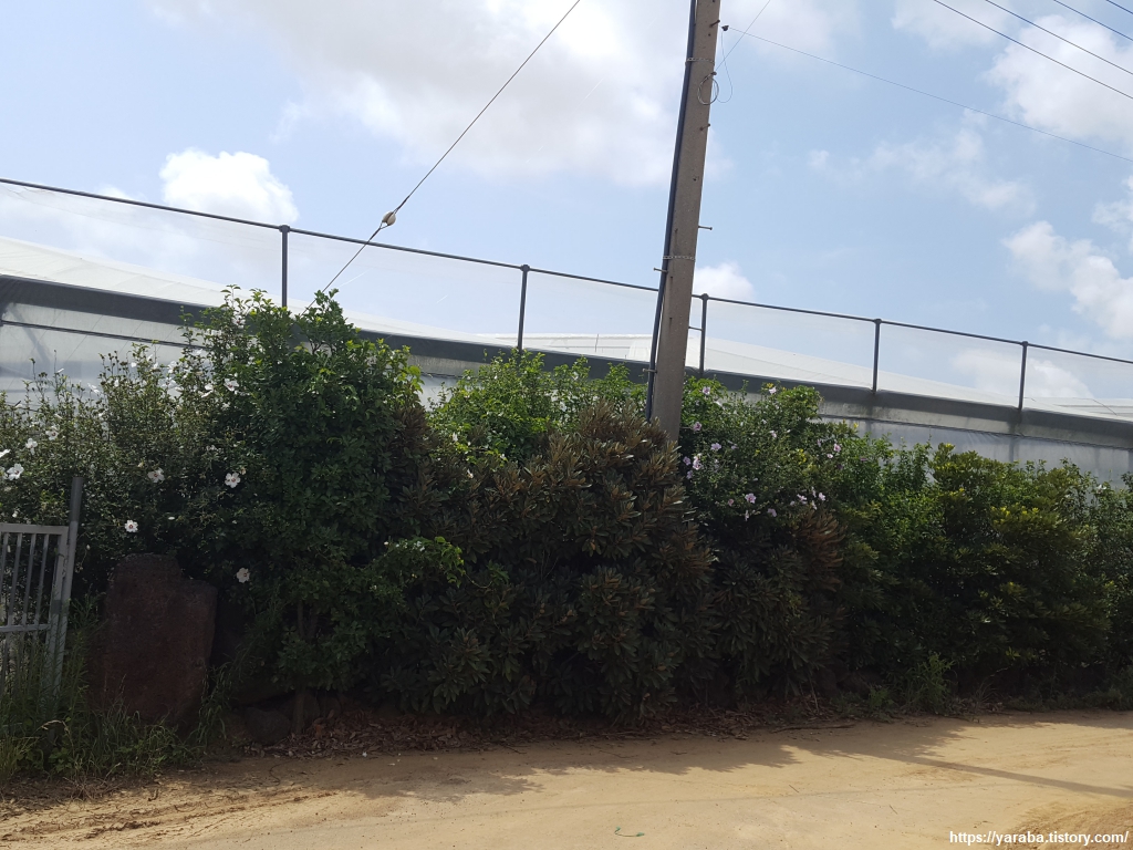 한 비닐하우스 농가에서 활짝 핀 무궁화를 만났다. "무궁화 삼천리"라는 애국가 가사에 제주도가 빠질 리는 없을 것이다. 제주도에서 자생하는 노랑 무궁화인 황근은 아니지만 아무튼 활짝 핀 무궁화가 반갑다.