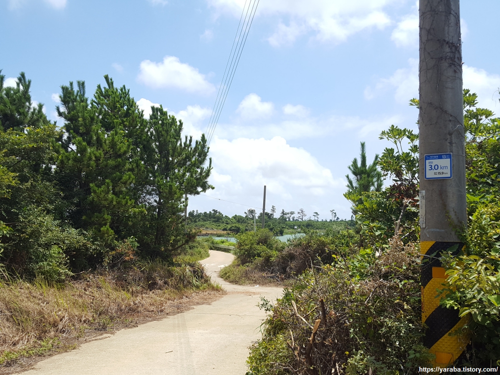 교차로 인근의 연못을 지나 내륙으로 더 깊숙하게 들어간다. 나무, 풀, 콘크리트 농로, 구름, 전봇대, 전선 등 멍 때리며 걷기 좋은 소재들이다.