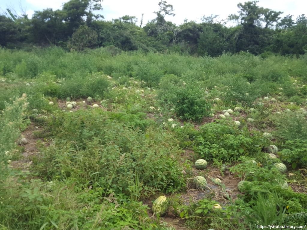 우회로 옆에서 만난 밭에서는 버려진 수박들이 뒹굴고 있다. 버린 거라면 하나 깨 먹을까? 하는 유혹도 마음속으로 훅 들어온다. 육지의 경우에도 노지에서 재배하는 수박은 전체 재배량의 20퍼센트도 되지 않는다고 하는데 제주에서 수박을 노지 재배하기는 쉽지 않은 도전인 모양이다. 비가 많이 와도 안되고, 폭염도 농사를 망치는 원인이라고 한다. 수박밭도 안타까운 모습이지만, 참깨밭을 보아도 조금 안타까운 마음이 든다. 건실하게 잘 자란 참깨밭에 무슨 말일까? 싶지만 저 큰 밭을 노부부가 낫 들고 베어내서 트럭으로 옮기고, 비닐을 덮었다, 걷었다 하면 말려서, 깨를 털 때까지 생각하면 아아! 하는 탄식이 절로 나온다.