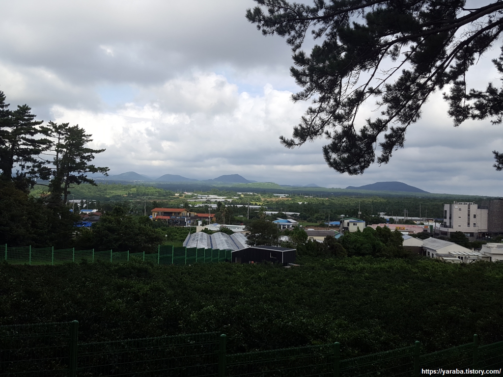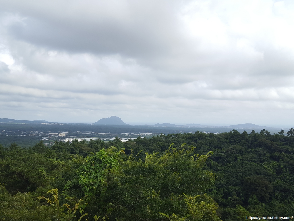 남쪽으로 바라본 풍경, 산방산, 단산과 금산, 모슬봉, 제주 영어 교육 도시도 눈에 들어온다.