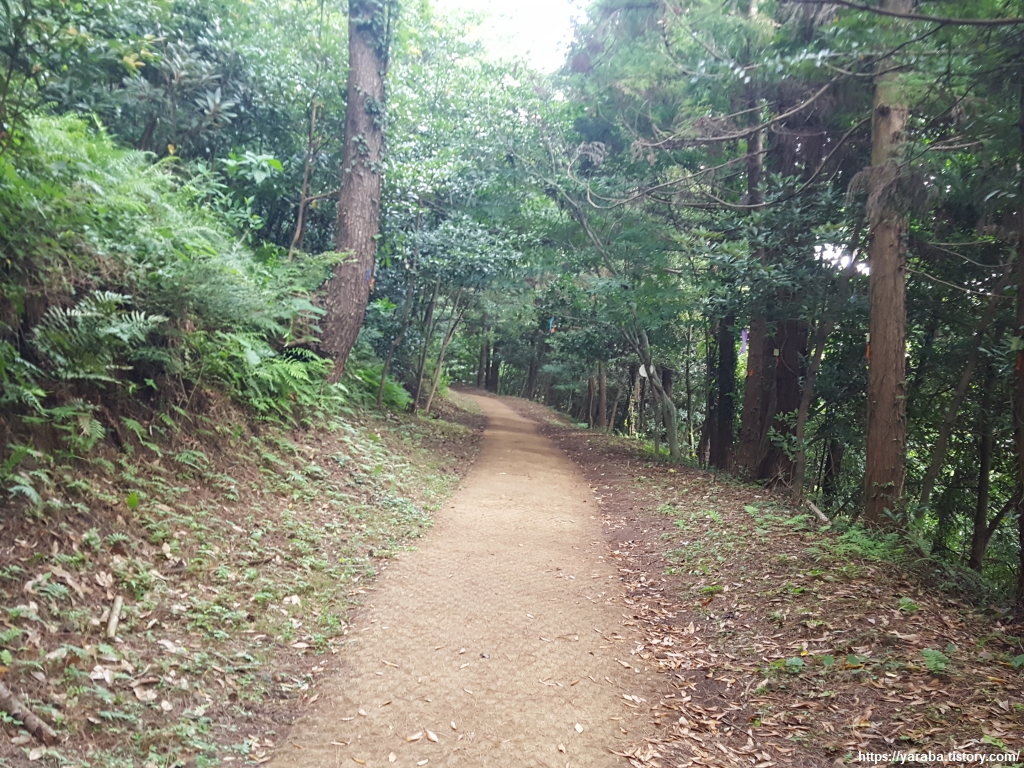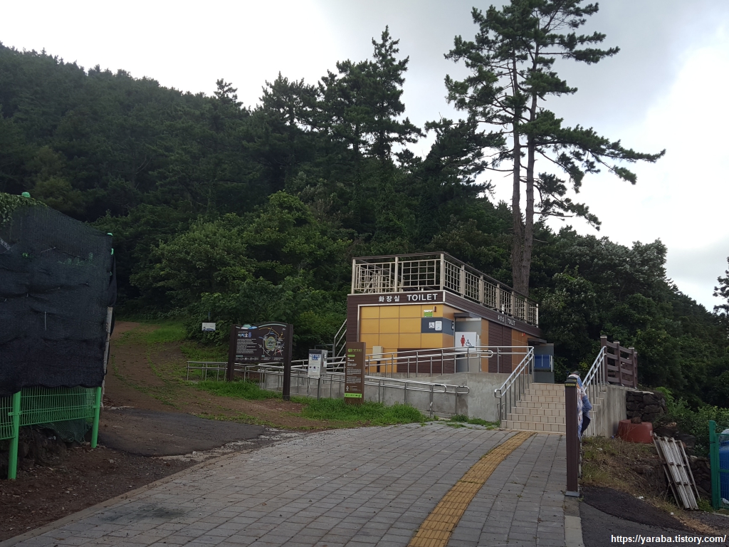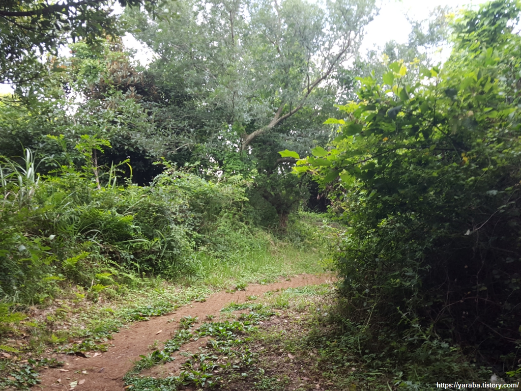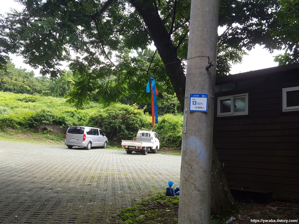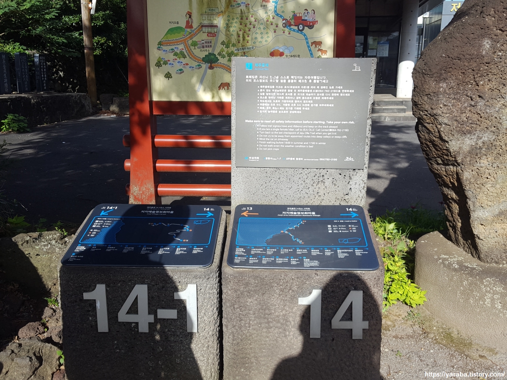 다음날 아침 이번 여정의 마지막 날 오늘도 하늘은 쾌청하다. 장마 기간에 어떻게 우리가 걸었던 일주일 동안만 비가 오지 않았는지, 그야말로 하늘이 도운 일정이었다. 중산간서로를 따라서 북쪽으로 이동하면 올레길 13코스를 끝내면서 녹차밭을 볼 수 있는 14-1 코스와 오늘 우리가 걸을 14코스의 시작점을 만날 수 있다.
