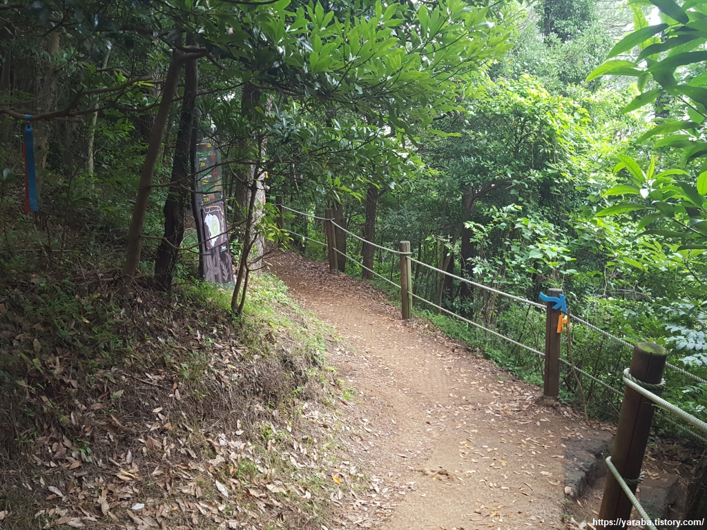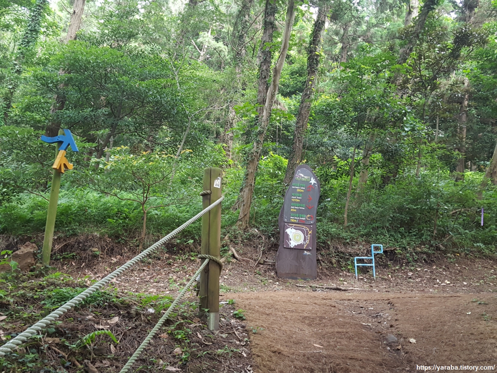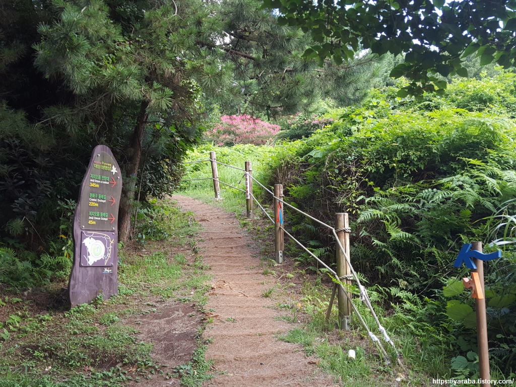 오름 입구에서 45미터만 걸어 올라가면 저지오름 둘레길을 만난다. 둘레길에서 분화구로 올라가는 지점 인근으로는 벤치들이 있어서 옆지기와 배낭은 벤치에 남겨두고 가벼운 몸으로 혼자만 분화구에 다녀오기로 했다.