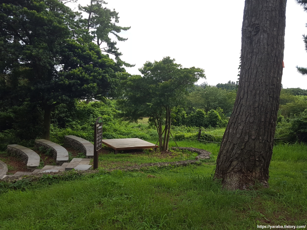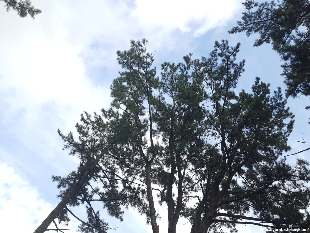 먼저 가서 숙소 체크인도 하고 옆지기를 편하게 데리고 오겠다는 생각이었지만 그 또한 또 다른 일을 만드는 것이란 생각이 들었다. 짝꿍이 같이 가야 모든 일은 자연스럽게 처리되는 법이니까...... 다행히 길 끝에 작은 야외 공연장 같은 공간과 평상이 있었다. 옆지기가 언제 올지 모르겠지만 올 때까지 하늘 보면서 멍 때리기 하자며 벌러덩 누웠다. 오후 5시를 바라보는 시각, 아직 해가 지는 시간은 아니지만 구름이 많아 주변은 어둑어둑하다. 벌러덩 누워 숲 사이로 하늘을 보는 맛도 나름 재미있었다.