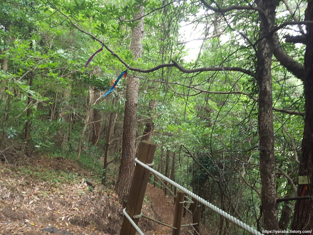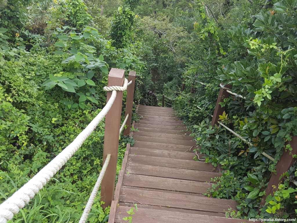 분화구 둘레길을 걷다가 분화구 아래로 내려갈 수도 있는데 계단을 통해 90미터를 내려가면 분화구 중심에 닿을 수 있지만 그냥 숲이다.