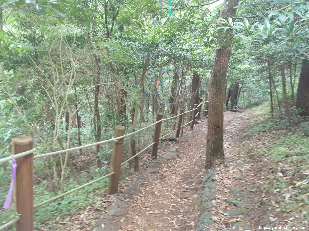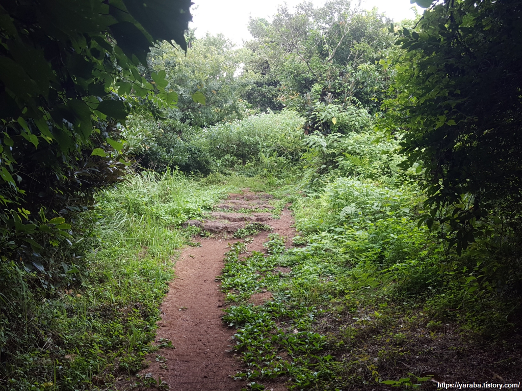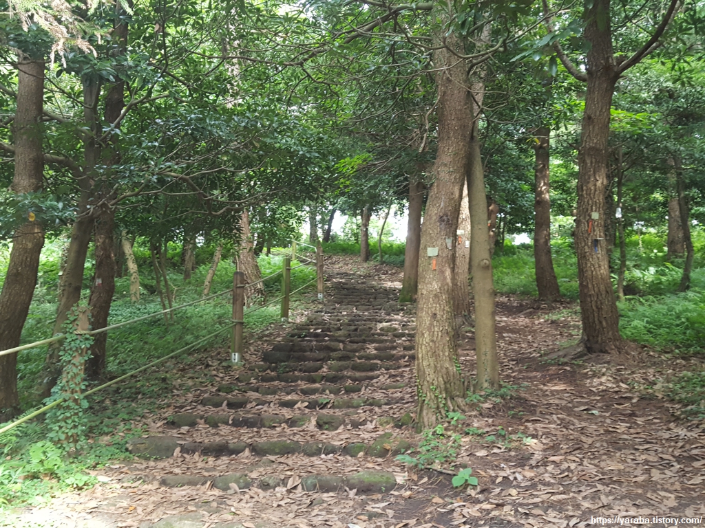 저지오름의 베스트 풍경을 꼽는다면 개인적으로는 분화구로 오르는 길에 쭉쭉 뻗은 나무숲을 뽑을 것이다. 여러 나무 아름다운 숲을 만났었지만 이렇게 경사가 급한 곳에서 쭉쭉 뻗은 아름다리 나무들 사이로 돌계단이 이어진 곳은 이곳이 처음이었다.