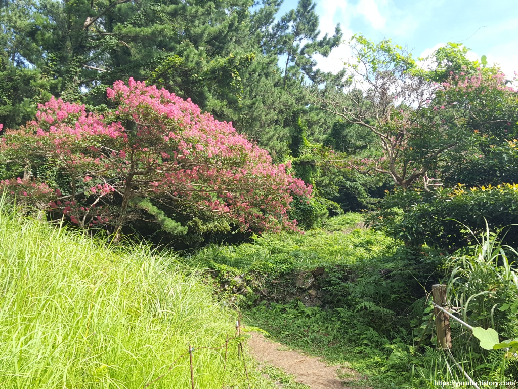 정갈한 산책로를 따라 오름을 오르기 시작한다. 입구에서는 배롱나무가 붉은 꽃으로 사람들을 반긴다. 조금 늦은 시간인데도 다녀가는 사람이 많았다.