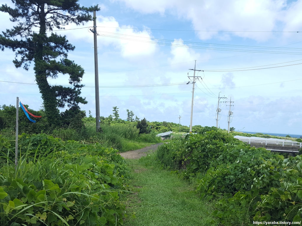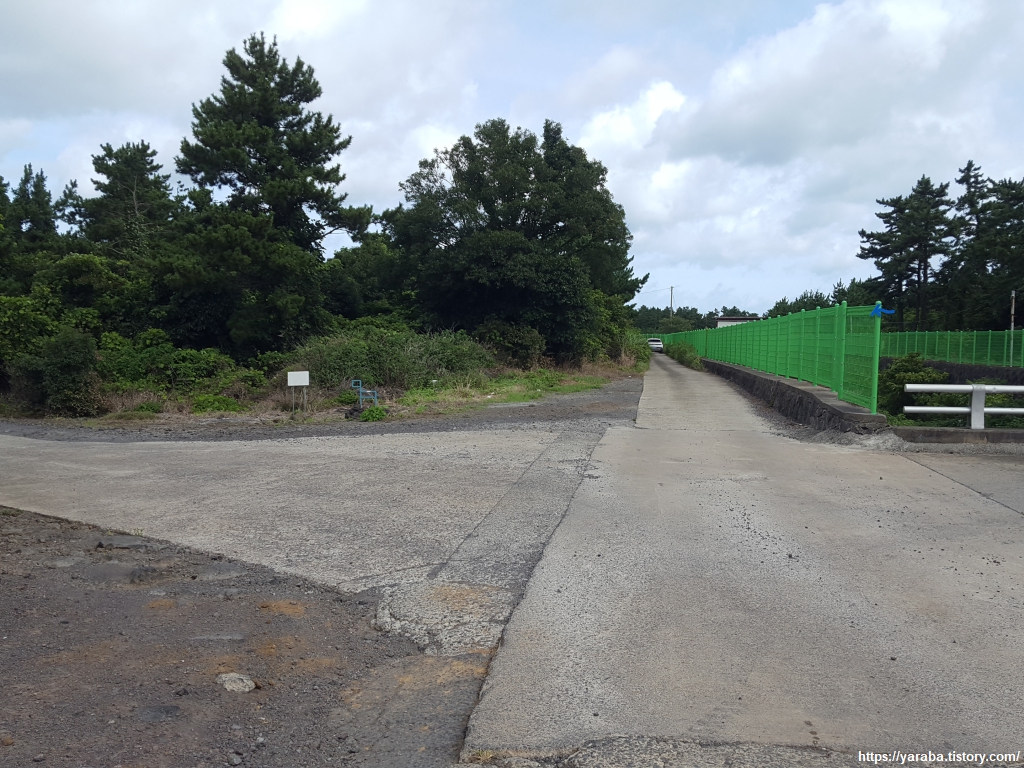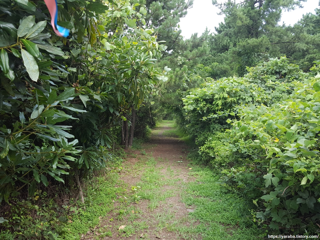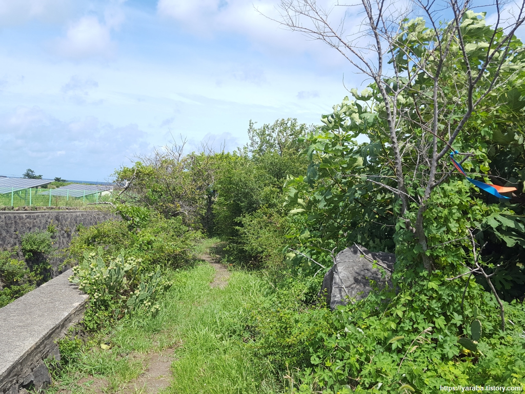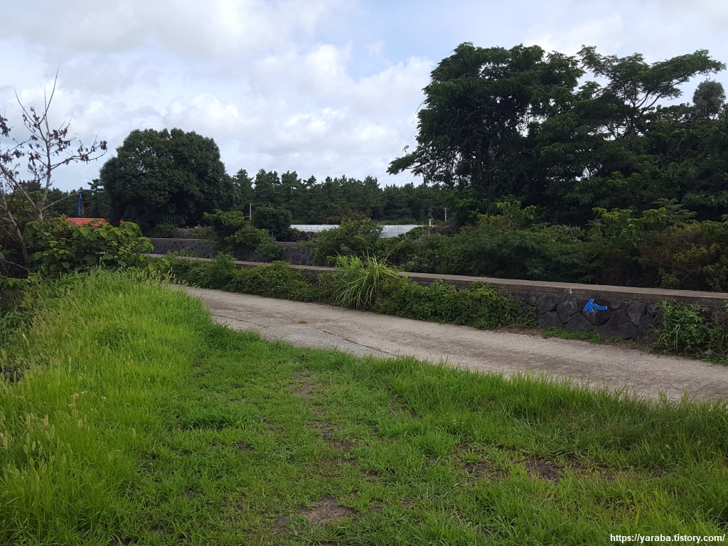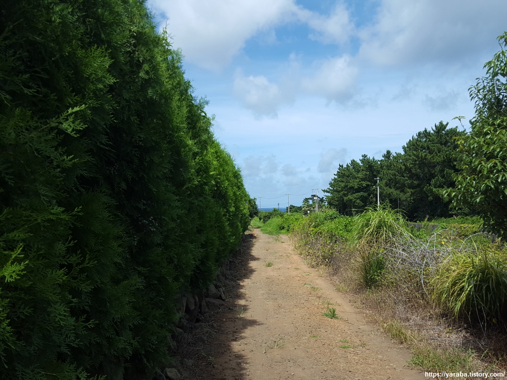 역시 감귤밭을 지날 때는 방풍목으로 심어둔 나무들이 한 풍경한다. 농장 주인은 방풍목을 보존하고 지자체는 방풍목을 예쁘게 가지치기해주어 지역의 관광 자원화하는 협력이 있다면 좋지 않을까? 하는 생각을 해본다. 멀리 수평선이 눈에 들어오기 시작한다.