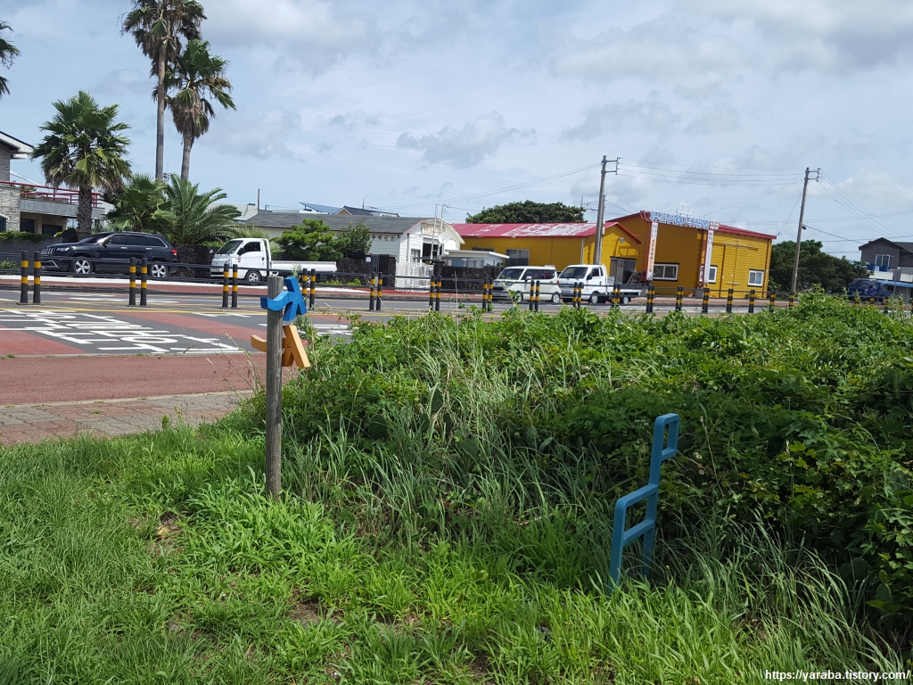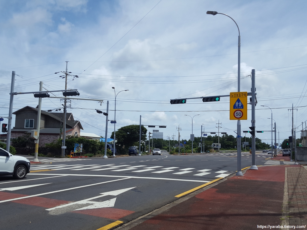 하천을 따라서 해안으로 계속 직진하면 좋겠지만 일주서로 4차선 도로가 길을 가로막는다. 우측으로 조금 이동하여 횡단보도로 일주서로를 건넌다.