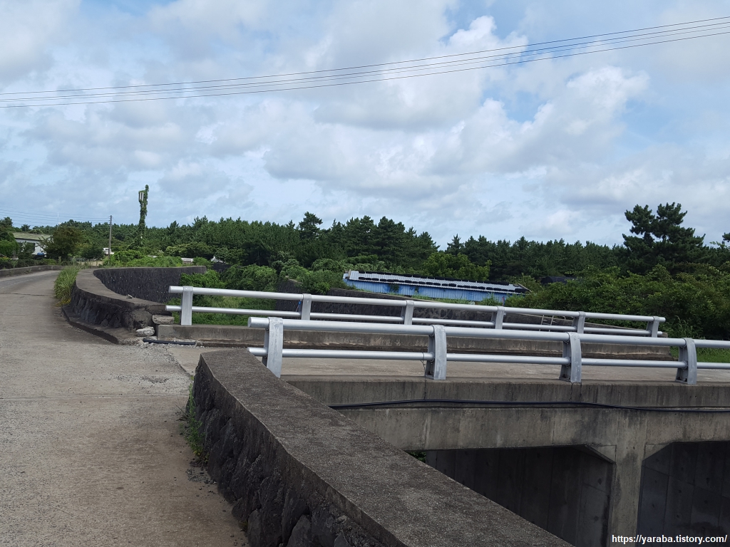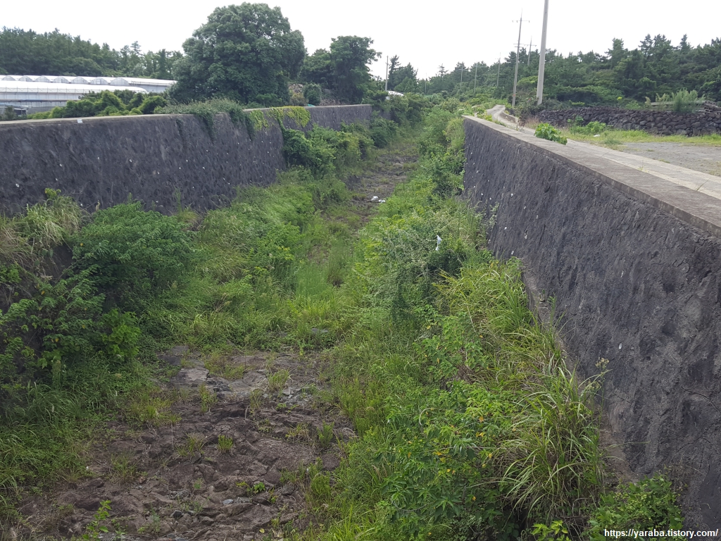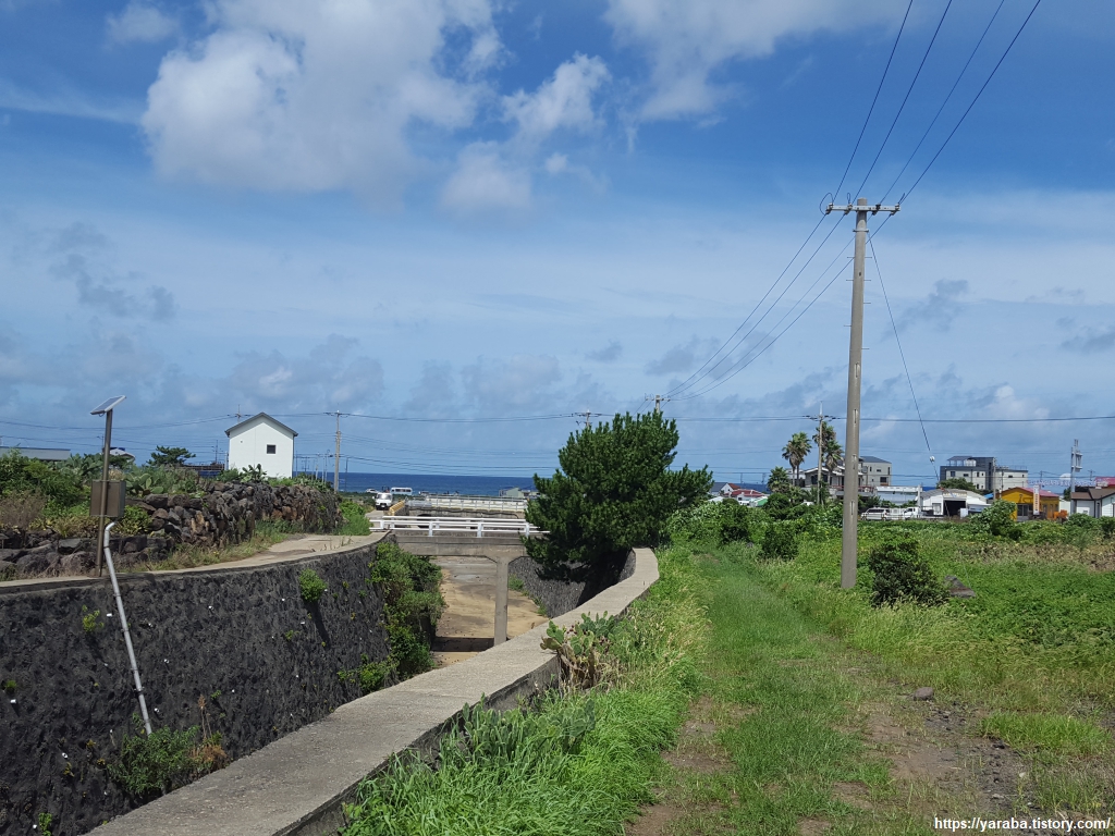 뙤약볕 아래 땀을 주체할 수 없는 상황이지만 푸르름이 가득한 들길은 참 아름답다. 물 한 방울 없이 현무암 바닥만 드러내고 있었던 수로는 이제는 바다와 만나는 지점까지 아예 콘크리트 바닥이다. 하천이라기보다는 거대한 배수로라고 하는 것이 맞는 것 같다.