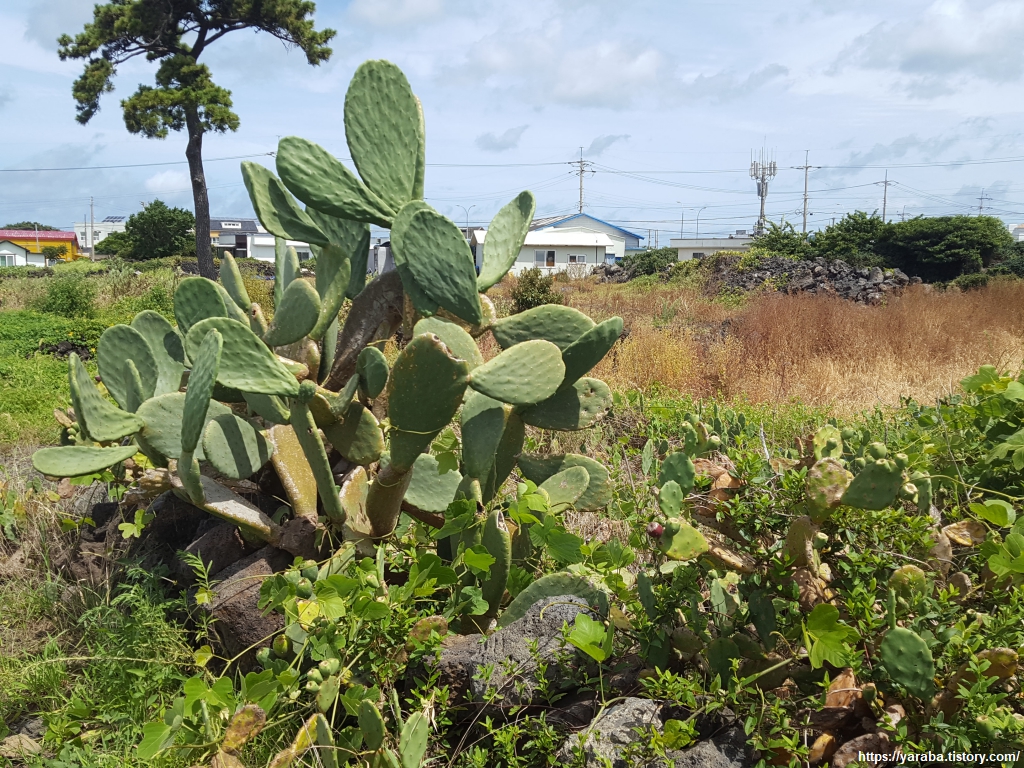 월령리의 상징과도 같은 백년초가 열매를 맺었다. 자색으로 익은 열매도 있다. 멕시코 원산인데 2백여 년 전 해류에 떠밀려와 자생하기 시작했다고 추정하고 있다고 한다. 손바닥 선인장으로도 불린다.