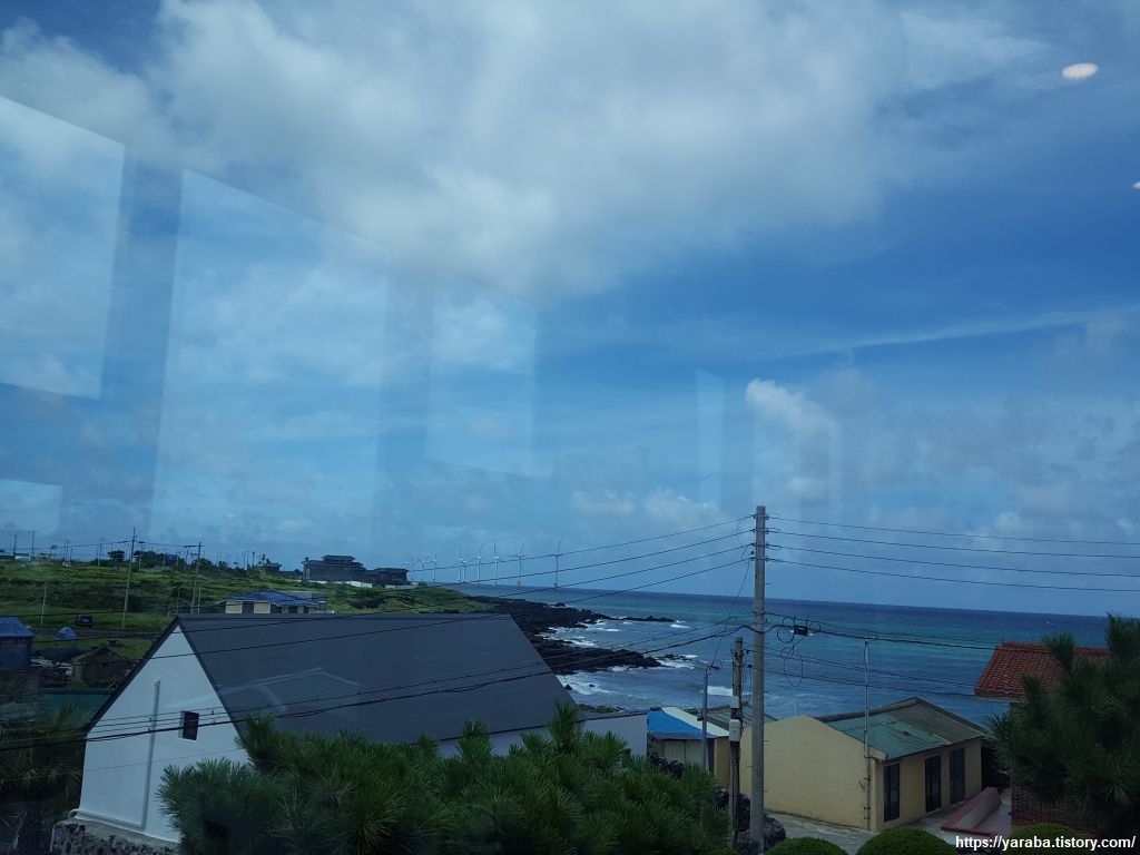 12시를 바라보는 시각, 마노라는 카페 2층에서 더위도 식히고 넉넉한 휴식을 가지기로 했다. 카페 창문으로 보이는 풍경은 한경면 판포리 해안으로 멀리 두모리의 해상 풍력 발전 단지도 보인다.