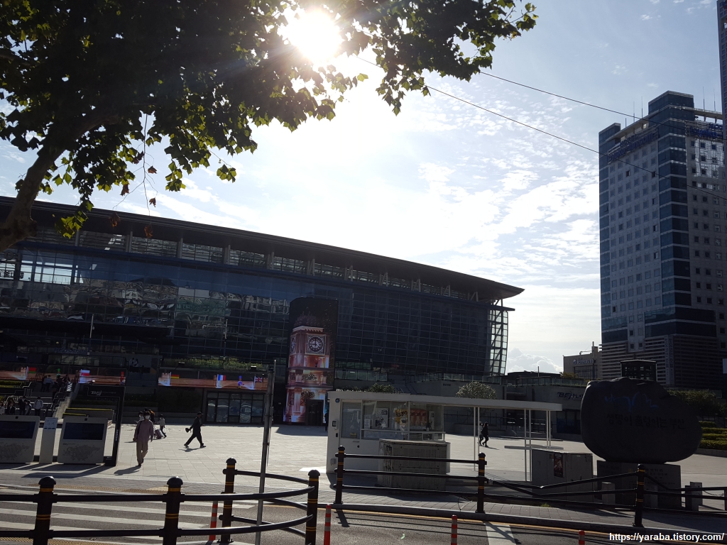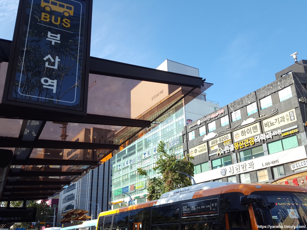 오래간만에 도착한 부산역은 역 전면에 스크린 배치해 놓고 독특한 애니메이션을 틀고 있었다. 오륙도로 가는 27번 버스를 타기 위해 부산역 광장의 버스 정류장으로 이동한다. 주말 아침인데도 사람들로 북적이고 해운대 방면으로 가는 버스는 사람이 많아서 다음 버스를 타는 사람이 있을 정도였다.