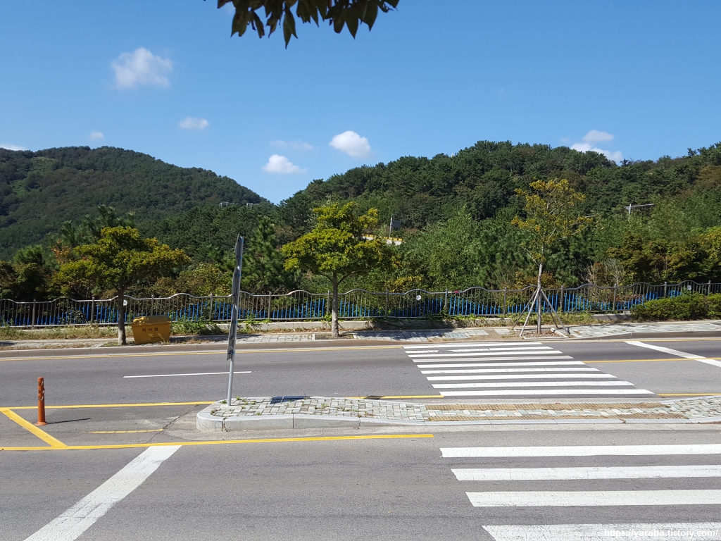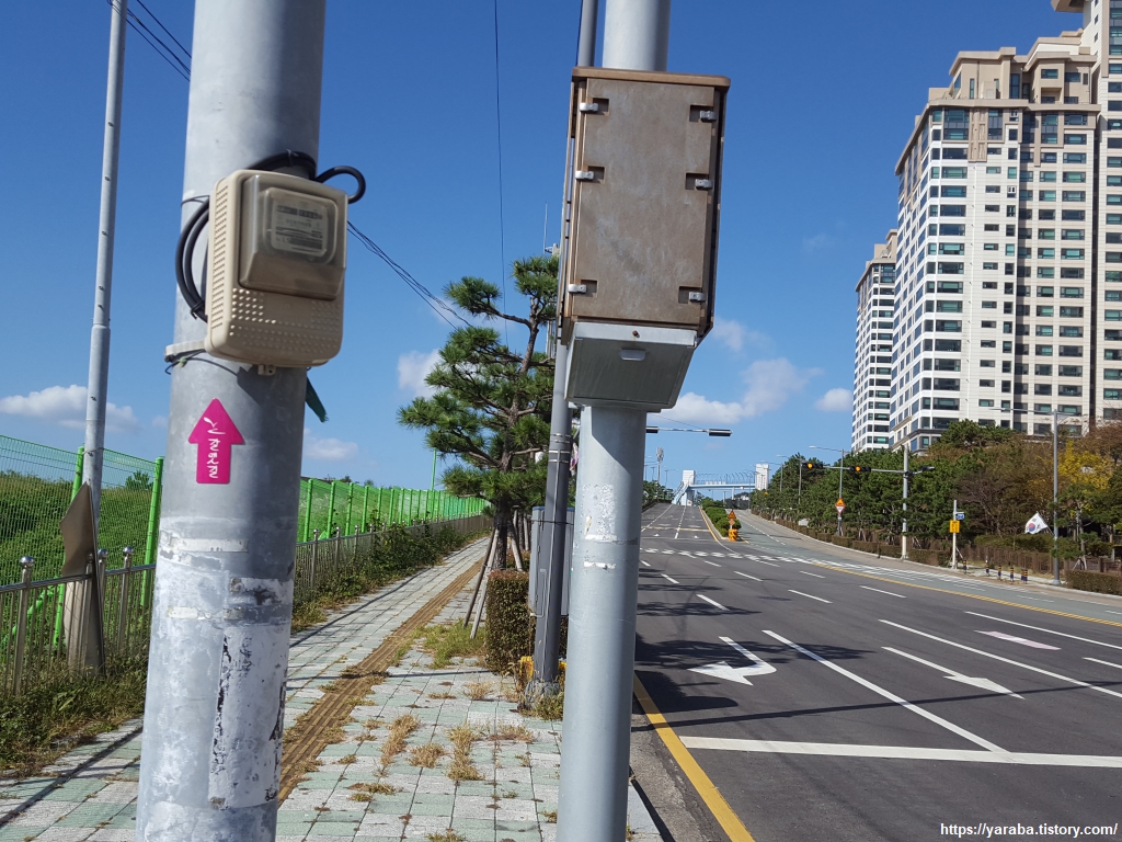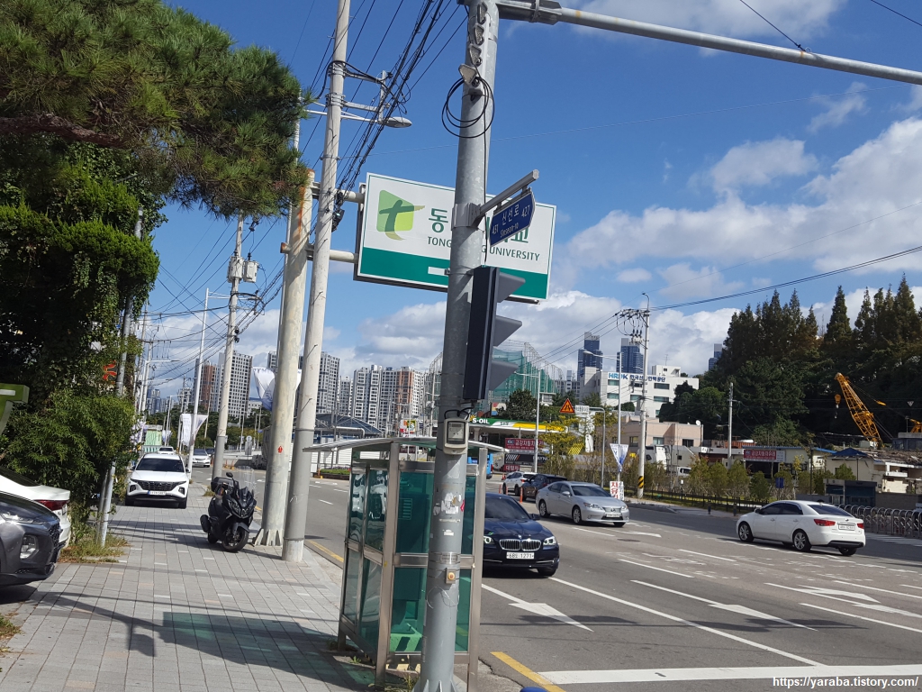 신선대 컨테이너 터미널 입구에서 우회전하여 아파트 단지 앞을 가로질러 동명 대학교를 향해서 걷는다.