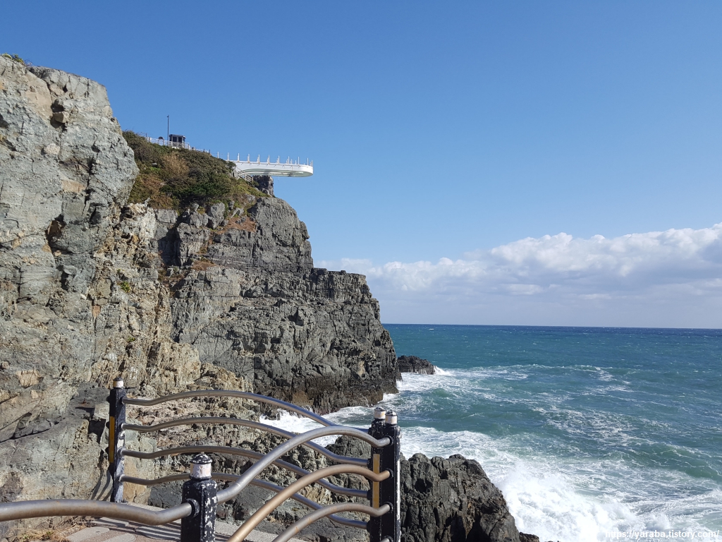 스카이워크 위에서는 만나지 못했던 절경을 만난다. 스카이워크 아래의 까마득한 바위 절벽, 세찬 파도가 들이치는 갯바위는 스카이워크 아래에서만 만날 수 있는 절경이다. 저 바위들은 얼마나 많은 세월을 지내어 왔을까?