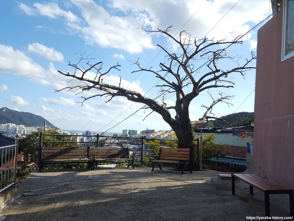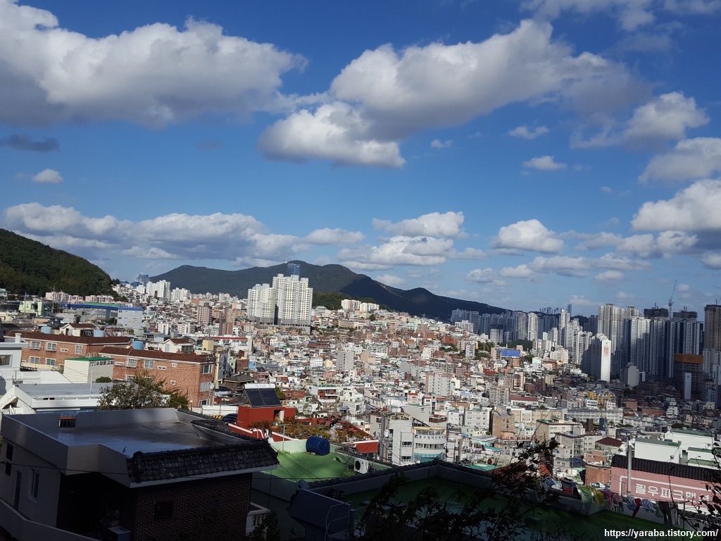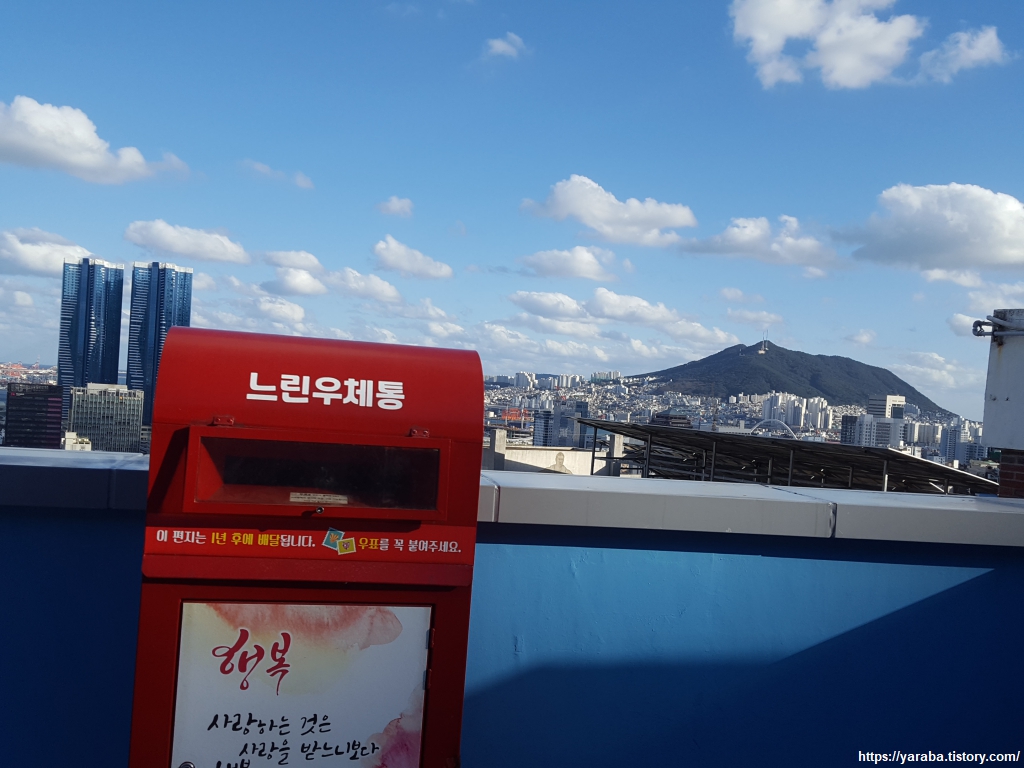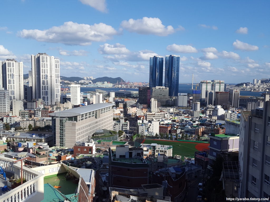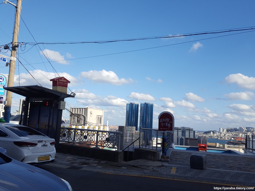 유치환 우체통 전망대에서 바라본 풍경이다. 정면으로 보이는 큰 건물은 무슨 공공기관인가? 하는 추측을 했었는데 알고 보니 부산 고등학교 건물이었다. 무려 9층짜리 고등학교 건물이라니! 높아야 4층 내지 5층이었던 학교 건물을 보던 상식이 깨지는 순간이다. ㅎㅎ