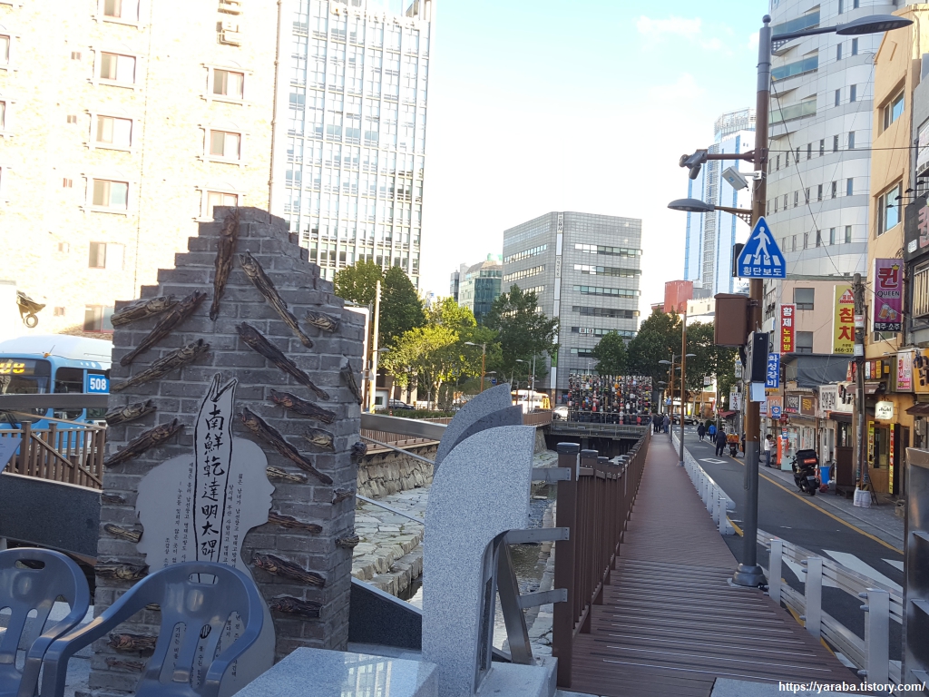 초량 전통 시장 앞은 복개했던 초량천이 복원되어 있었다. 청계천 복원을 모델로 삼아 시작했다고 하지만 아직 복원되지 않은 구간이 많아서 여름철이면 악취가 나기도 한다고 한다. 명태로 소재로 세워 놓은 남선건달명태비라는 독특한 조형물이 눈길을 끈다. 소설가 조갑상의 '테하차피의 달'에 등장하는 부산 최초의 물류 창고인 남선 창고와 관련된 이야기를 적어 놓았다. 주로 명태를 많이 보관했다 하여 명태 고방으로 불렸다고 한다.