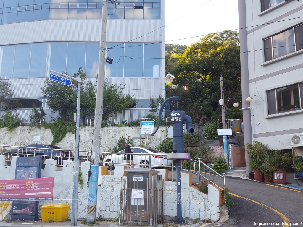 부산역으로 내려가는 남파랑길은 초량 이바구길과 일부 겹치기도 한다. 문제는 남파랑길은 길을 건너서 망양로 도로를 얼마간 계속 따라가야 하는데 우리는 그만 부산역 표지판을 보고 바로 좌회전하고 말았다. 근처에서 남파랑길 표식을 발견하지 못한 까닭인데 그래도 모로 가도 부산역으로 가면 되지 하는 생각으로 그냥 길을 따라 내려가기로 했다. 커다란 우물 조형물에 이바구 캠프라 적혀 있는데 초량 이바구길에 있는 도시 민박촌이다.