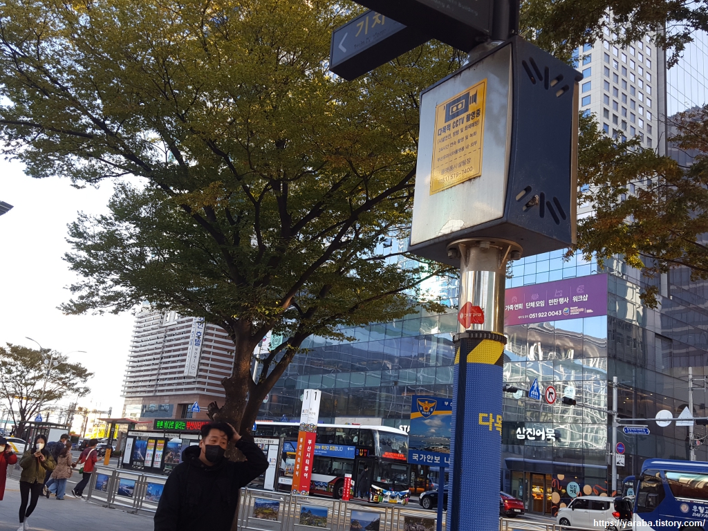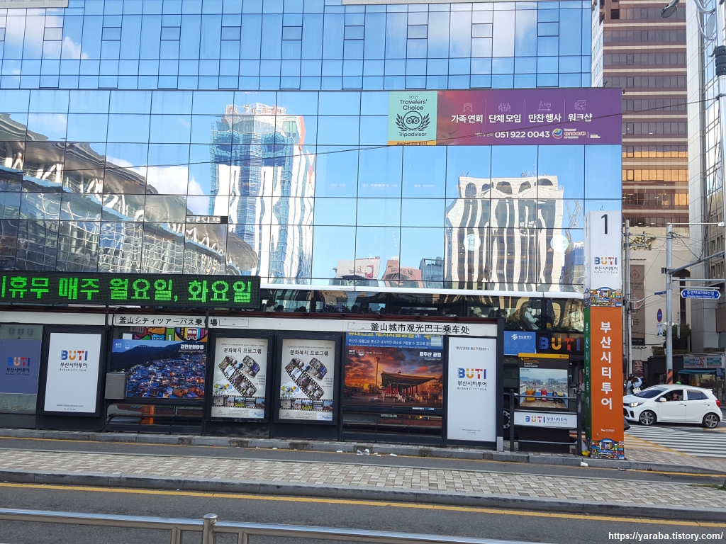 남파랑길 1코스 종점 바로 앞에는 2층 버스가 투입되는 부산 시티투어 정류장이 자리하고 있다. 네 가지 노선이 있는데 해운대 쪽의 블루 라인을 제외하면 나머지 노선은 모두 부산역을 거친다. 주말은 운행 횟수가 더 많아지고, 월요일과 화요일은 휴무라고 한다. 다이내믹한 부산을 감상하기에 좋은 수단이라는 개인적인 생각인데 중간중간 만나는 버스를 보면 이용하는 사람도 많았다.