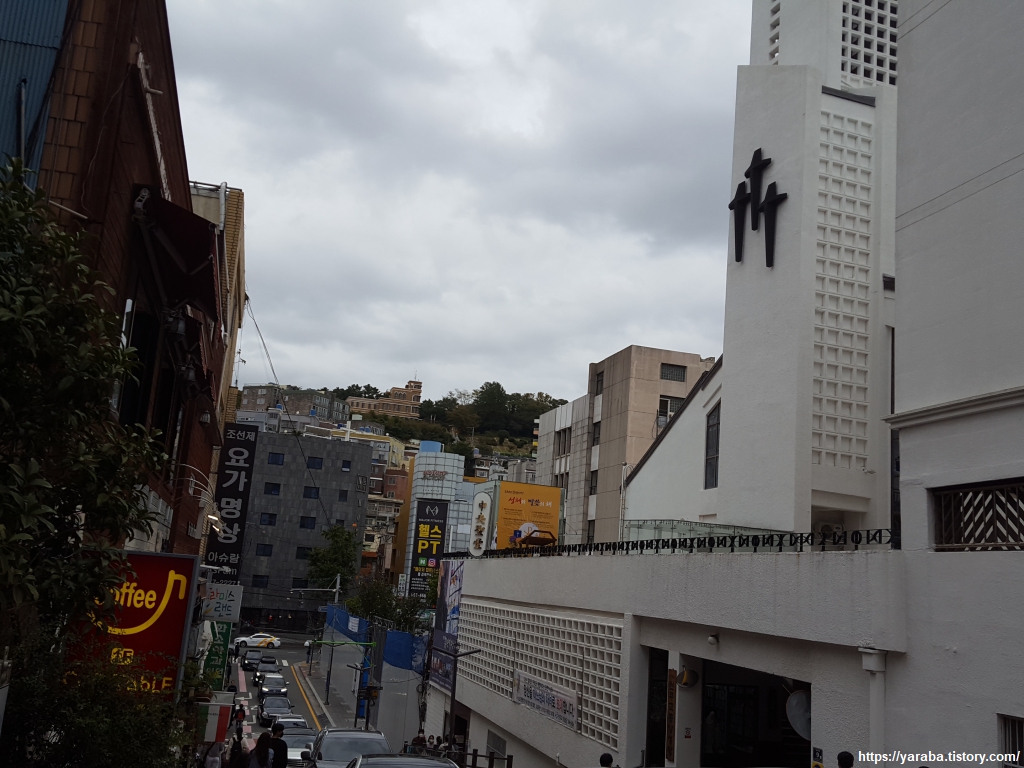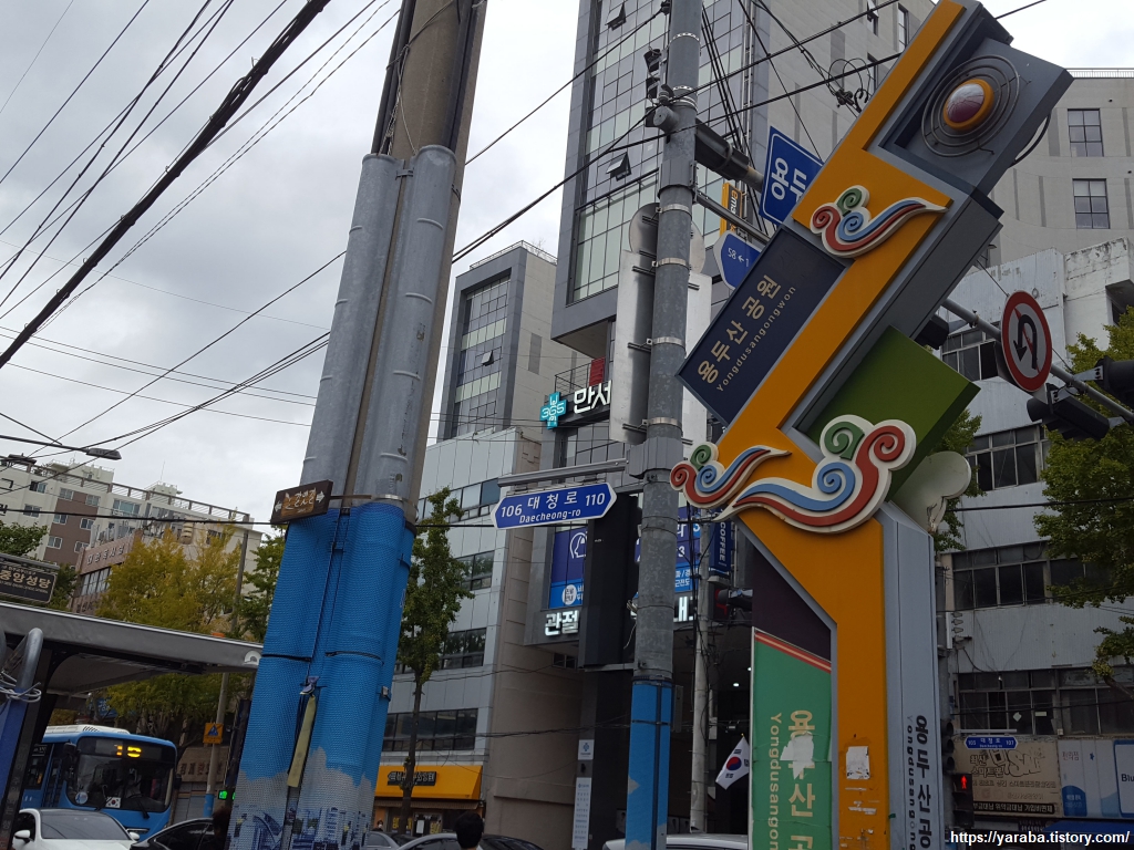 주교좌 중앙 성당 옆을 지나 길을 내려가면 용두산 어귀 삼거리에서 대청로 도로를 만나는데 이곳에서 좌회전하여 도로를 따라 보수동 책방 골목으로 향한다.