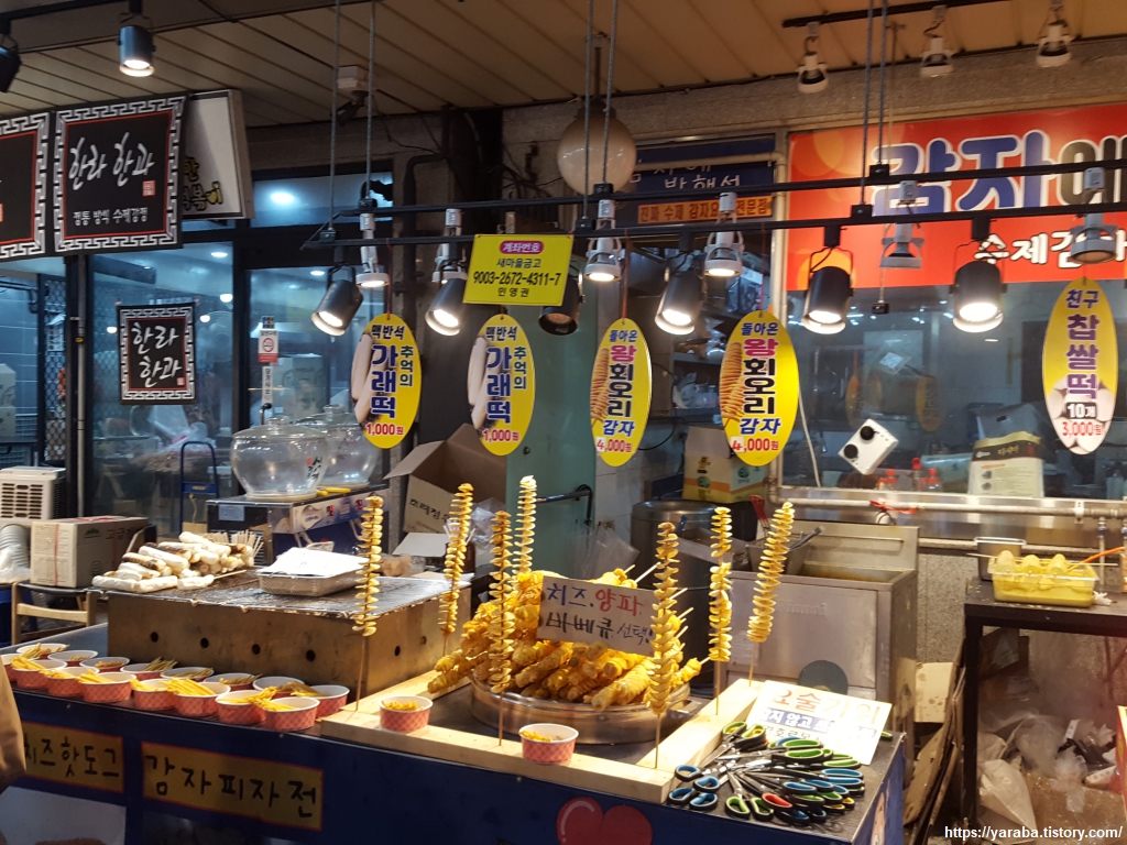 시장 안으로 들어서자 양쪽으로 먹거리들이 넘쳐난다. 당장이라도 자리에 앉아 명태전이나 모둠 튀김을 시켜놓고 사람들 시선은 아랑곳하지 않으면서 맛있게 먹고 싶다. 그런데 웬일일까? 이런 군것질 좋아하는 옆지기 님이 유혹에 넘어가지 않으신다. 사람들 많은 곳은 그리 좋아하지 않는 까닭일 수도 있겠다. 아니면 넉넉하게 먹은 점심 식사 때문일 수도 있다. 처음 보는 명태전과 비빔 당면은 지금 생각해도 군침이 도는 음식이었다.