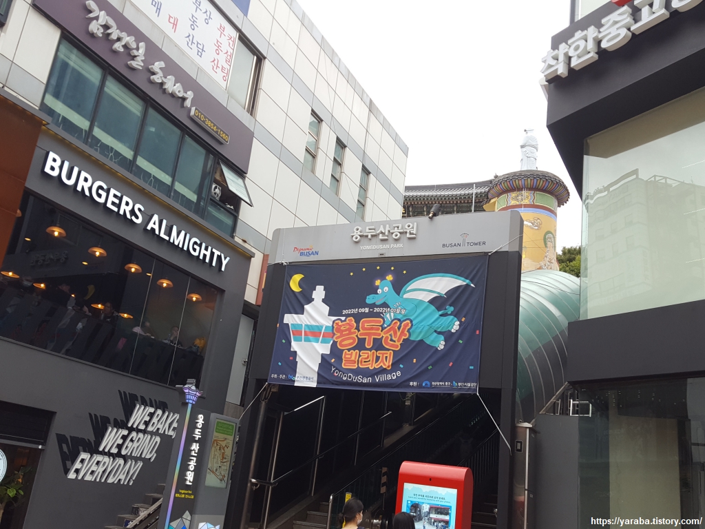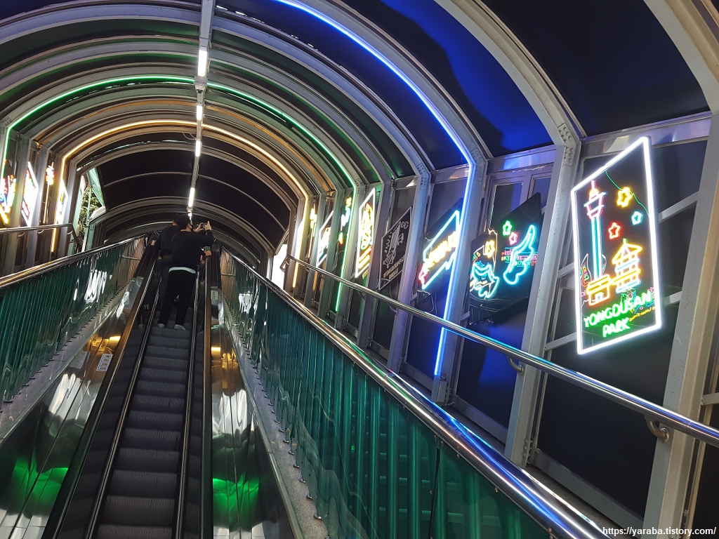그런데, 광복로를 걷다 보니 의도치 않게도 용두산 공원으로 가는 에스컬레이터를 타게 되었다. 화려한 에스컬레이터를 타고 올라가면서 이 좋은 길을 놔두고 남파랑길은 왜 빙 돌아갈까? 하는 생각도 있었지만 편하게 길을 올라가는 입장에서는 마냥 좋았다. 홍콩 시내의 에스컬레이터를 타는 느낌이었다.