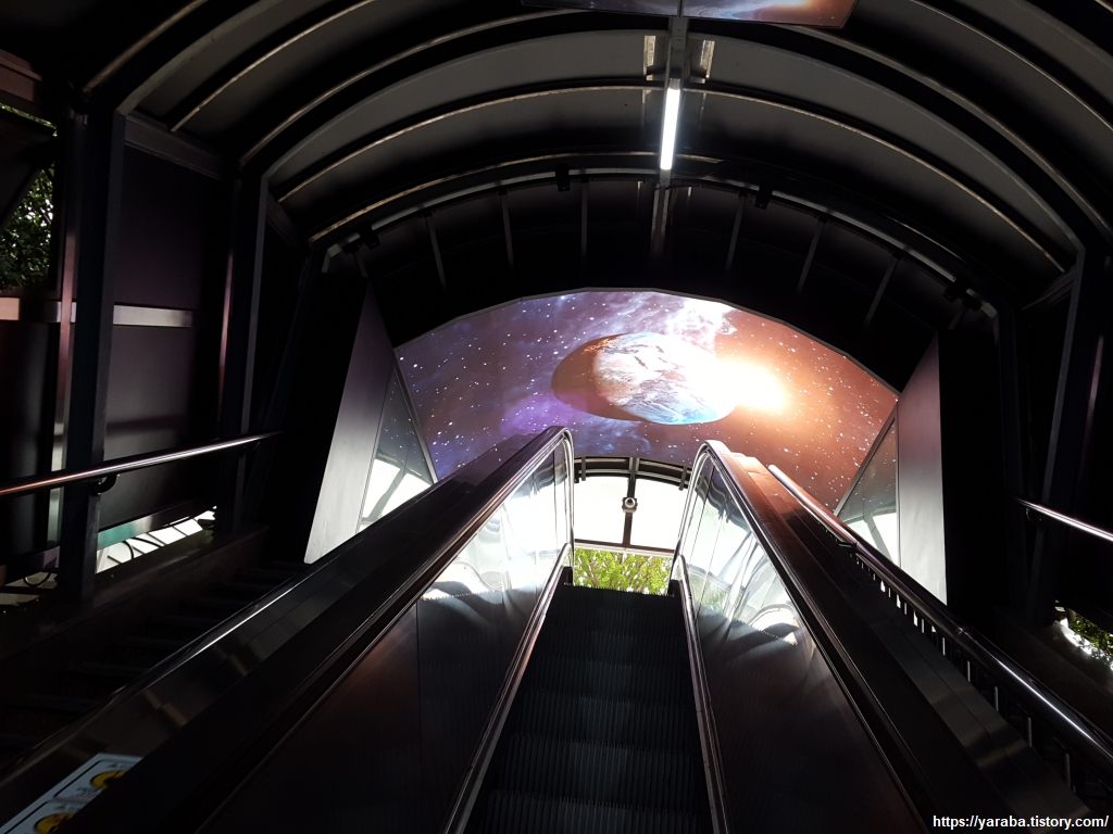 에스컬레이터 초입에는 네온사인으로 장식했는데, 끝부분에는 스크린까지 설치되어 있었다. 에스컬레이터에서 나오니 인공 폭포와 부산 타워가 우리를 반긴다.