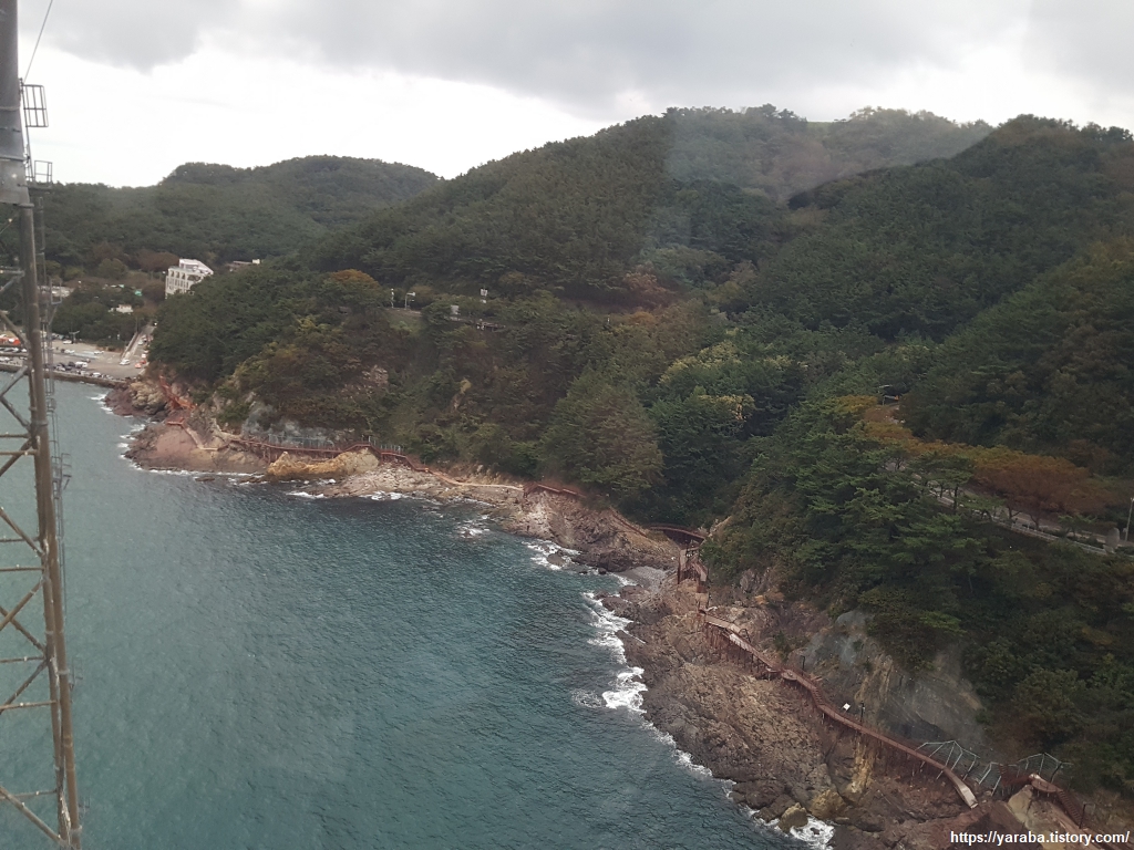 케이블카 아래로 절벽을 따라 이어진 데크길을 살펴보니 중간중간에 끊어진 구간들이 있었다. 일반적인 데크 산책길이 아니라 절벽에 붙은 잔교 수준으로 아찔해 보인다. 그렇지만 길이 망가지고 위험하니 남파랑길도 이길로 가지 않고 도로를 걷도록 한 모양이다.