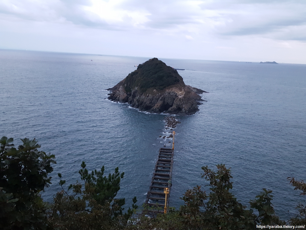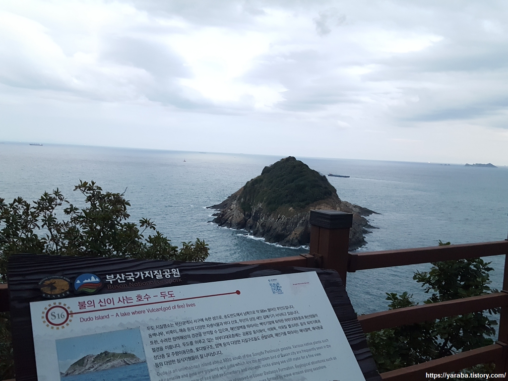 드디어 송도 반도 끝의 두도 전망대에 도착했다. 두도의 두자는 머리 두자인데 이름의 유래는 알려지지 않았다. 퇴적암 바위로 이루어진 무인도로 전망대에서 바라보니 예전에 연결 통로가 있었던 모양이다. 부산 서구에서는 두도와 육지를 연결하는 출렁다리를 만들 계획이라고 한다. 두도의 퇴적암 층에서는 공룡알 화석이 대량으로 나왔다고 한다.